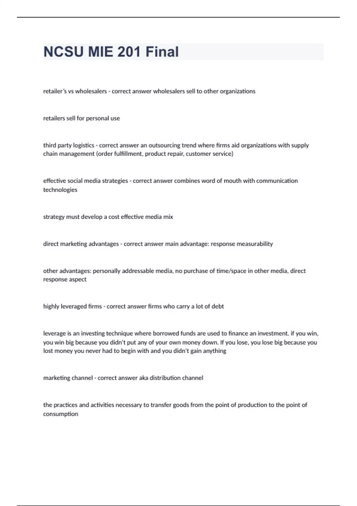 NCSU MIE 201 Final retailer’s vs wholesalers - correct answer wholesalers sell to other organizations retailers sell for personal use third party logistics - correct answer an outsourcing trend where firms aid organizations with supply chain management (order fulfillment, product repair, customer service) effective social media strategies - correct answer combines word of mouth with communication technologies strategy must develop a cost effective media mix direct marketing advantages - correct answer main advantage: response measurability other advantages: personally addressable media, no purchase of time/space in other media, direct response aspect highly leveraged firms - correct answer firms who carry a lot of debt leverage is an investing technique where borrowed funds are used to finance an investment. if you win, you win big because you didn't put any of your own money down. If you lose, you lose big because you lost money you never had to begin with and you didn't gain anything marketing channel - correct answer aka distribution channel the practices and activities necessary to transfer goods from the point of production to the point of consumption distribution strategy - correct answer the overall plan for moving products through intermediaries and on to final customers financial management - correct answer planning for a firms money needs and managing the allocation and spending of funds financial plan definition - correct answer document that outlines funds needed for a certain period of time; includes the sources and potential uses of those funds three sources of input for the financial plan - correct answer strategic plan: establishes companies overall direction; identifies needs for major investments companies financial statements: income statement, statement of cash flows; tells the manager how much cash the company has now and how much it is likely to generate in the future external financial environment: interest rates and the overall health of the economy EOQ - correct answer economic order quantity; quantity of materials that when ordered provide lowest ordering and storage costs three budgeting challenges - correct answer limited amount of money revenue/costs are hard to predict hard to tell what needs to be spent hedging - correct answer protecting against cost increases by fixing future supply costs zero based budgeting - correct answer all departments start at $0 each year and justify every item in the budget four types of budgets - correct answer start up: get off the ground