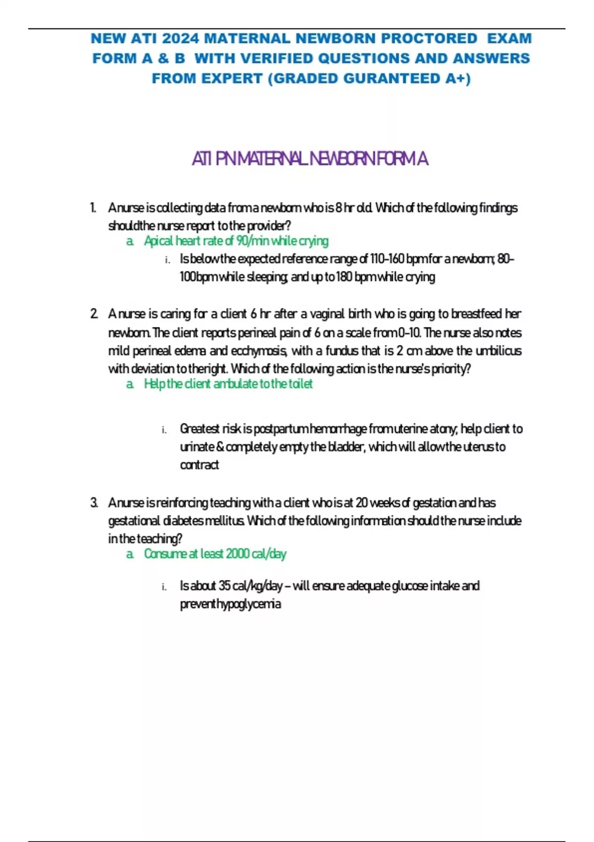 NEW ATI 2024 MATERNAL NEWBORN PROCTORED EXAM FORM A & B WITH VERIFIED QUESTIONS AND ANSWERS FROM EXPERT (GRADED GURANTEED A+ ATI PN MATERNAL NEWBORN FORM A 1. A nurse iscollecting data from a newborn whois 8 hrold. Which of thefollowing findings shouldthe nursereport tothe provider? a. Apical heart rateof90/min whilecrying i. Is below theexpected referencerangeof 110-160 bpm for a newborn; 80- 100bpm while sleeping; and up to180 bpm while crying 2. A nurse is caring for a client 6 hr after a vaginal birth who is going to breastfeed her newborn.The client reports perineal pain of 6 on a scale from 0-10. The nurse also notes mild perineal edema and ecchymosis, with a fundus that is 2 cm above the umbilicus with deviation to theright. Which of thefollowing action is the nurse’s priority? a. Help theclient ambulatetothetoilet i. Greatest risk is postpartum hemorrhage from uterine atony; help client to urinate & completelyemptythe bladder, which will allow the uterusto contract 3. A nurse isreinforcing teaching with a client whois at 20 weeksof gestation and has gestational diabetes mellitus. Which of thefollowing information should the nurseinclude in theteaching? a. Consume at least 2000 cal/day i. Is about35 cal/kg/day – willensure adequate glucoseintake and preventhypoglycemia 4. A nurse is reinforcing teaching about risk factors for respiratory distress syndrome (RDS) in newborns with a group ofclients who are pregnant. Which of thefollowing risk factors shouldthe nurse include? a. Prematurity i. A newborn whois premature hasinadequatesurfactant production, which canlead to RDS 5. A nurse is caring for a client who is planning to become pregnant. The client asks the nurse why folic acid supplements are necessary. The nurse should inform the client that the purposeof thefolic acid supplement is to do which of the following? a. Preventcertain kindsof birth defects i. Help prevent neural tube defects 6. A nurse is reinforcing discharge teaching about methods to prevent engorgement during lactation suppression with a client whois bottle-feeding her newborn. Which of the followingstatements should the nurse identify as an indication that the client understands the instructions? a. “I will applycold cabbageleavestomy breaststhroughout the day.” i. Frequent application ofcold leavesto breastscan preventengorgement ii. Should also applyice packsorcold compressesto breasts, take mild analgesics,and wear a well-fitting and supportive bra 7. A nurse is assisting with thecareof a client whois at 40 weeksof gestation and isin active labor.Which of thefollowing findings should the nurse report to the charge nurse? a. Prolonged deceleration ofFHR i. Can be a manifestation of an emergentcondition, such as uterinerupture orumbilical cord prolapse ii. Charge nurseshould notify provider about thischange 8. A client requests information about the useof a diaphragm for birth control. Which of thefollowing statements should the nurse make? a. “You will need toreplaceyour diaphragm every 2 years.” 9. A nurse is caring for a client who is at 11 weeks of gestation and reports frequent vomiting. Which of the following findings should the nurse identify as an indication that theclient hashyperemesis gravidarum? a. Ketonuria i. Occurs duetothe breakdown of fatsecondaryto malnutrition orstarvation 10. A nurse is collecting data from a client who is at 36 weeks of gestation during a prenatalexamination. Which of the following findings should the nurse report to the provider? a. Blurred vision i. An indication that theclient might have preeclampsia 11. A nurse iscaring for a newborn who has a high-pitched cry and does not respond to consolingefforts. Which of the following neonatal data collection tools should the nurse expect to complete? a. Neonatal abstinencescoring system i. Exhibiting manifestationsofopioid withdrawal and should bescreened ii. Additional manifestationsof withdrawal includerestlessness, tremors, increasedmuscle tone, and an exaggerated Moro reflex 12. A nurseiscaring for a newborn whoisreceiving phototherapy. Which of thefollowing actionsshould the nursetake? a. Place an opaque mask over the newborn’seyes i. To prevent damagetotheretinas – remove mask for feedings 13. A nurseis assisting in thecareof a newborn immediatelyfollowing birth. Which of the followingimagesshould the nurseidentify as an indication that the newborn was a myelomeningocele? a. First picture – exposed spinalcord and fluid filled sac, priorityintervention isto maintainthe integrity of the sac i. Myelomeningoceleoccurs when the neural tubefailstoclose, and the meningesand spinal cord herniate 1. Defect mostoften occurs in thelumbar area and may becovered by athin membranous sa 14. A nurse isreinforcing teaching with a client whois at9 weeksof gestation and reports frequent episodesof nausea and vomiting. Which of thefollowing instructionsshould the nurseinclude? a. Consumesmall meals frequentlyeach day i. 5-6small mealsthroughout the day – should avoid an emptystomach, as thisincreases nausea