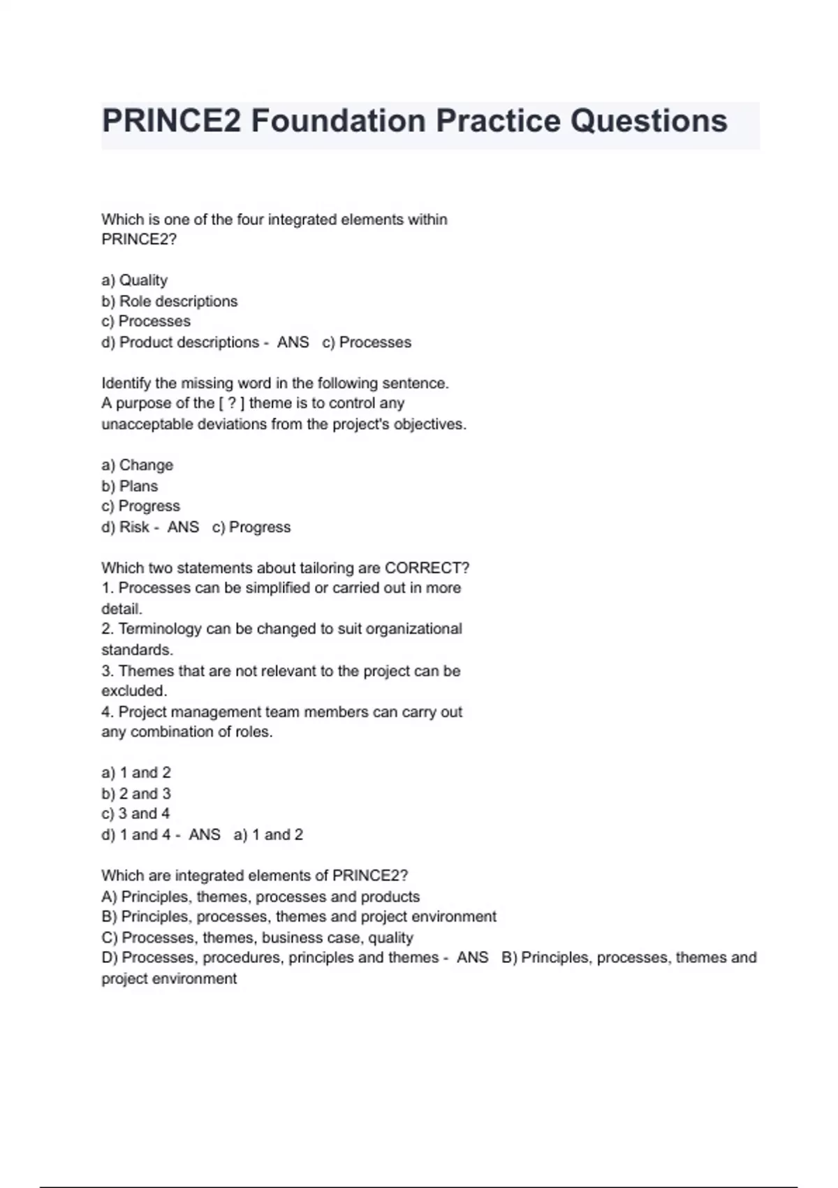 PRINCE2 Foundation Practice Questions With Verified Solutions Which is one of the four integrated elements within PRINCE2? a) Quality b) Role descriptions c) Processes d) Product descriptions - ANS c) Processes Identify the missing word in the following sentence. A purpose of the [ ? ] theme is to control any unacceptable deviations from the project's objectives. a) Change b) Plans c) Progress d) Risk - ANS c) Progress Which two statements about tailoring are CORRECT? 1. Processes can be simplified or carried out in more detail. 2. Terminology can be changed to suit organizational standards. 3. Themes that are not relevant to the project can be excluded. 4. Project management team members can carry out any combination of roles. a) 1 and 2 b) 2 and 3 c) 3 and 4 d) 1 and 4 - ANS a) 1 and 2 Which are integrated elements of PRINCE2? A) Principles, themes, processes and products B) Principles, processes, themes and project environment C) Processes, themes, business case, quality D) Processes, procedures, principles and themes - ANS B) Principles, processes, themes and project environment Which feature of PRINCE2 describes "aspects of project management that must be continually addressed"? A) Processes B) Principles C) Themes D) Business Justification - ANS C) Themes PRINCE2 can be applied to any type of Project? A) True B) False - ANS A) True PRINCE2 focuses on describing what needs to be done, rather than prescribing how it should be done/ A) True B) False - ANS A) True PRINCE2 guidance does not cover specialised aspects of delivery or detailed planning and control techniques Which are features of a PRINCE2 project? Select all that apply. A) It applies all of the principles B) It meets the minimum requirement of the Themes C) Is using PRINCE2, recommended techniques or equivalent techniques D) It has processes that satisfy objectives of PRINCE2's processes - ANS A,B,C,D All options are correct. A PRINCE2 project is one that applies all of the principles, meets minimum requirements of themes, has processes that satisfy the objectives of its processes, and uses PRINCE2 recommended, or equivalent techniques. Which of the following are characteristics of a project? Select all that apply. A) All projects are unique B) All projects must deliver more than they cost to run C) All projects have a defined start and end D) Projects involve people from different functions - ANS A,C,D What are the six aspects of a project's performance which need to be managed? A) Cost, time, quality, scope, risk, benefits B) Cost, time, quality, lag, benefits, risk C) Cost, time, scope, personnel, configuration, expected value D) Cost, time, quality, scope, version control, baselines - ANS A) Cost, time, quality, scope, risk, benefits PRINCE2 can be applied to projects and programmes. A) True B) False - ANS B) False PRINCE2 stands for PRojects IN Controlled Environments. There are other guidance for Programme Management. PRINCE2 requires the use of critical path analysis. A) True B) False - ANS B) False Critical Path Analysis is a detailed techniques for scheduling, outside of scope of PRINCE2. While important to successful projects, leadership, capability and interpersonal skills are beyond scope of PRINCE2. A) True B) False - ANS A) True