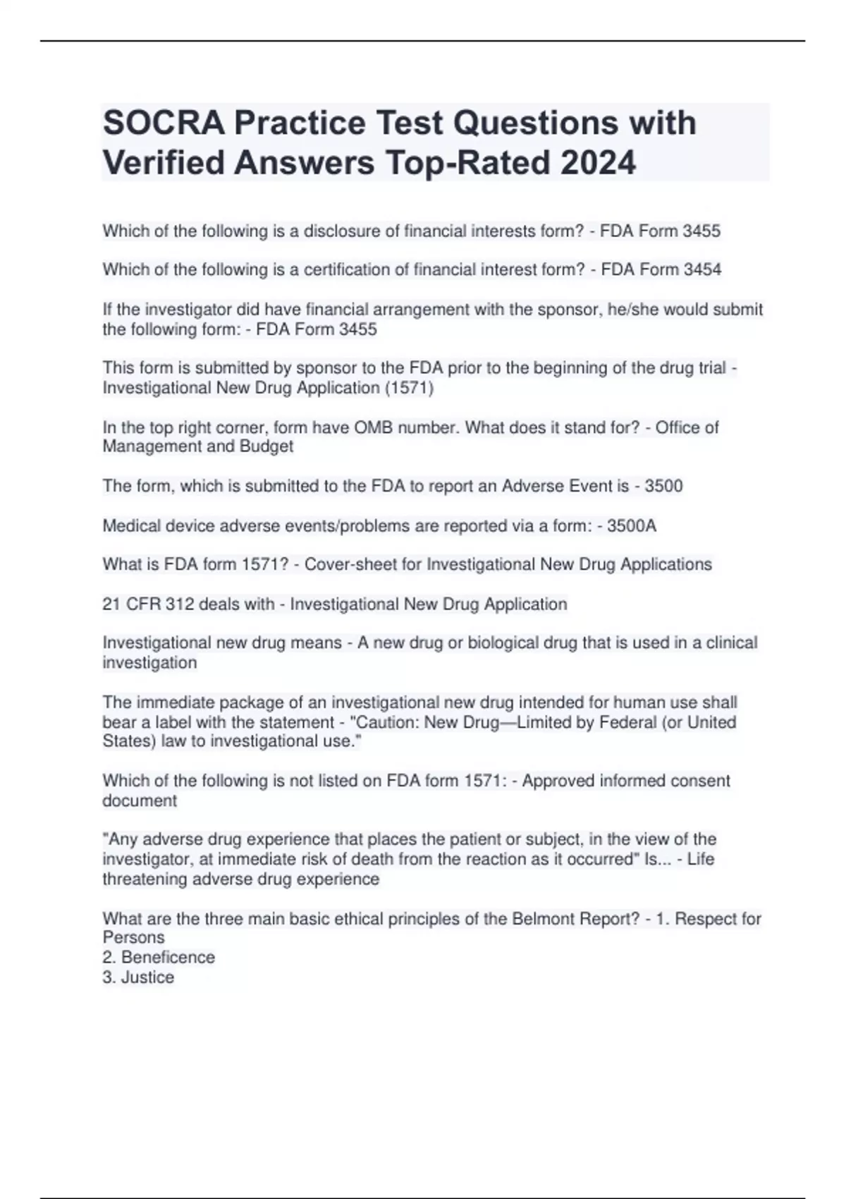Which of the following is a disclosure of financial interests form? - FDA Form 3455 Which of the following is a certification of financial interest form? - FDA Form 3454 If the investigator did have financial arrangement with the sponsor, he/she would submit the following form: - FDA Form 3455 This form is submitted by sponsor to the FDA prior to the beginning of the drug trial - Investigational New Drug Application (1571) In the top right corner, form have OMB number. What does it stand for? - Office of Management and Budget The form, which is submitted to the FDA to report an Adverse Event is - 3500 Medical device adverse events/problems are reported via a form: - 3500A What is FDA form 1571? - Cover-sheet for Investigational New Drug Applications 21 CFR 312 deals with - Investigational New Drug Application Investigational new drug means - A new drug or biological drug that is used in a clinical investigation The immediate package of an investigational new drug intended for human use shall bear a label with the statement - "Caution: New Drug—Limited by Federal (or United States) law to investigational use." Which of the following is not listed on FDA form 1571: - Approved informed consent document "Any adverse drug experience that places the patient or subject, in the view of the investigator, at immediate risk of death from the reaction as it occurred" Is... - Life threatening adverse drug experience What are the three main basic ethical principles of the Belmont Report? - 1. Respect for Persons 2. Beneficence 3. Justice What are the applications for the Belmont Report? - 1. Informed Consent 2. Assessment of Risk and Benefits 3. Selection of Subjects What phrase of a drug trial usually includes hundreds to thousands of volunteers? - Phase 3: These studies gather more information about safety and effectiveness, study different populations and different dosages, and uses the drug in combination with other drugs. What is a drug as defined by the FDA? - A drug is an product that is intended for use in the diagnosis, cure mitigation, treatment, or prevention of disease; and that is intended to affect the structure or any function of the body. What is Phase 1 of a clinical trial? - 20-80: Typical number of healthy volunteers used in Phase 1: this phase emphasizes SAFETY. What is Phase 2 of a clinical trial? - 100s: Typical number of patients used in Phase 2; this phase emphasizes EFFECTIVENESS What is Phase 3 of a clinical trial? - 1000's :Typical number of patients used in Phase. 3. These studies gather more information about safety and effectiveness, study different populations and different dosages, and uses the drug in combination with other drugs. What is Phase 4 of a clinical trial? - Post Marketing: Because it's not possible to predict all of a drug's effects during clinical trials, monitoring safety issues after drugs get on the market is critical. The role of FDA's post-marketing safety system is to detect serious unexpected adverse events and take definitive action when needed. The main concept of 21 CFR 50 is - Protection of Human Subjects Subpart D of 21 CFR 50 lists the - Additional Safeguards for children in Clinical Investigations The FDA may restrict, suspend, or terminate an institution's or IRB's use of the expedited review procedure when necessary to protect the rights or welfare of subject - a. true X (21 CFR 56.110 Subpart D) b. false A Phase ___ protocol is more flexible and less detailed than the others. - Phase 1 A source document is any document found that is associated with a clinical trial. - a. true b. false X (A source document is any document where the date are FIRST recorded)