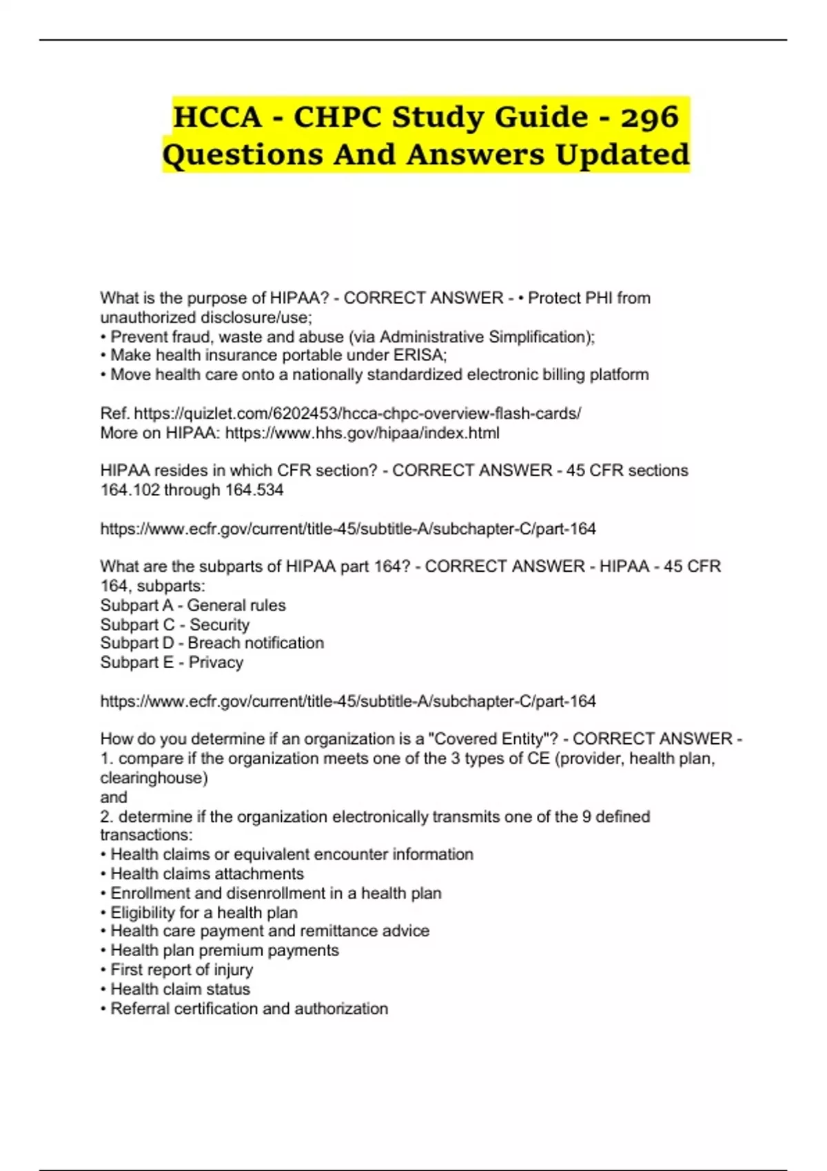 What is the purpose of HIPAA? - CORRECT ANSWER - • Protect PHI fromunauthorized disclosure/use; • Prevent fraud, waste and abuse (via Administrative Simplification); • Make health insurance portable under ERISA; • Move health care onto a nationally standardized electronic billing platform