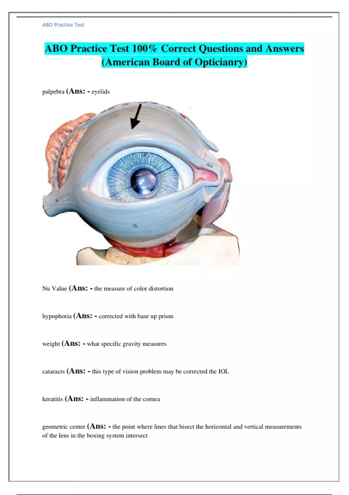 ABO Practice Test 100% Correct Questions and Answers (American Board of Opticianry) Nu Value (Ans: - the measure of color distortion hypophoria (Ans: - corrected with base up prism weight (Ans: - what specific gravity measures cataracts (Ans: - this type of vision problem may be corrected the IOL keratitis (Ans: - inflammation of the cornea