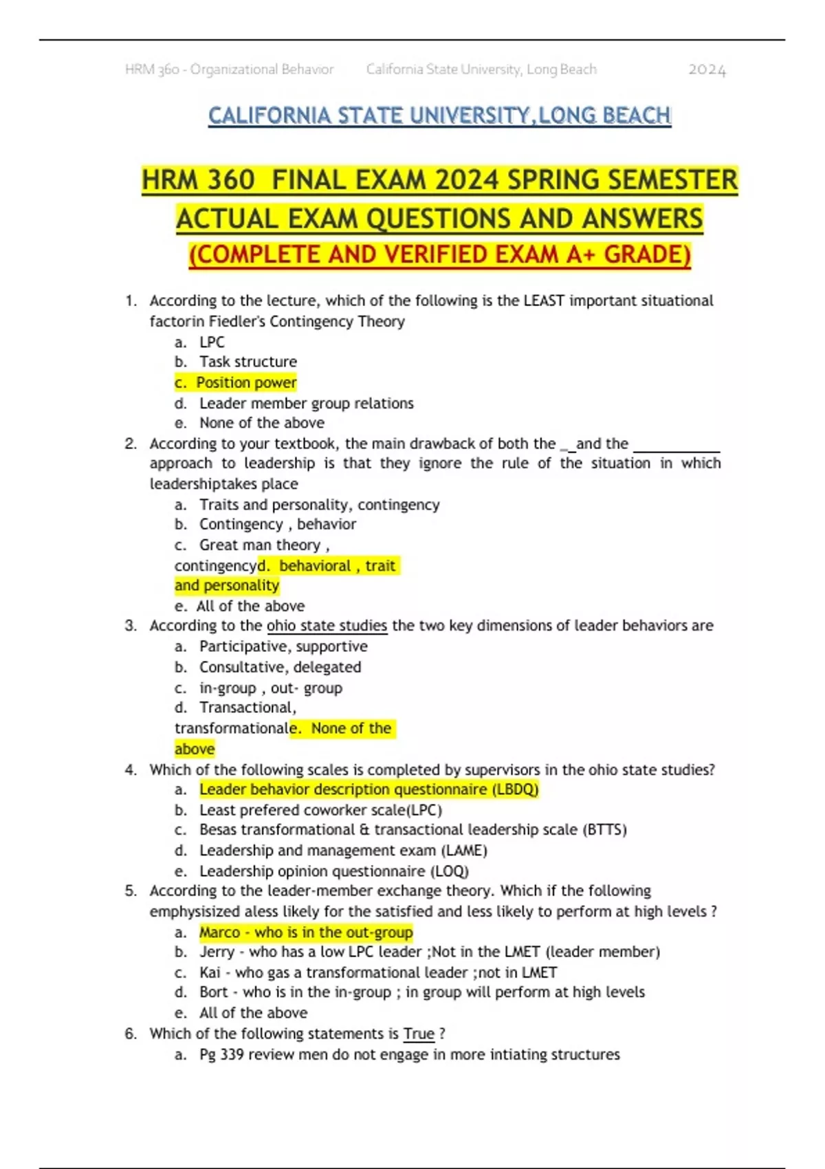 CALIFORNIA STATE UNIVERSITY,LONG BEACH FINAL EXAM 2024 SPRING SEMESTER ACTUAL EXAM QUESTIONS AND ANSWERS (COMPLETE AND VERIFIED EXAM A+ GRADE) 1. According to the lecture, which of the following is the LEAST important situational factor in Fiedler's Contingency Theory a. LPC b. Task structure c. Position power d. Leader member group relations e. None of the above 2. According to your textbook, the main drawback of both the _ and the approach to leadership is that they ignore the rule of the situation in which leadership takes place a. Traits and personality, contingency b. Contingency , behavior c. Great man theory , contingency d. behavioral , trait and personality e. All of the above 3. According to the ohio state studies the two key dimensions of leader behaviors are a. Participative, supportive b. Consultative, delegated c. in-group , out- group d. Transactional, transformational e. None of the above 4. Which of the following scales is completed by supervisors in the ohio state studies? a. Leader behavior description questionnaire (LBDQ) b. Least prefered coworker scale(LPC) c. Besas transformational & transactional leadership scale (BTTS) d. Leadership and management exam (LAME) e. Leadership opinion questionnaire (LOQ) 5. According to the leader-member exchange theory. Which if the following emphysisized a less likely for the satisfied and less likely to perform at high levels ? a. Marco - who is in the out-group b. Jerry - who has a low LPC leader ;Not in the LMET (leader member) c. Kai - who gas a transformational leader ;not in LMET d. Bort - who is in the in-group ; in group will perform at high levels e. All of the above 6. Which of the following statements is True ? a. Pg 339 review men do not engage in more intiating structures b. Women do not engage in consideration structures c. Both of the above d. None of the above 7. Which of the following leadership theories discusses autocratic, consultative, group, and delegated leadership styles? a. The Path-Goal theory b. Fiedler's Contingency theory c. The ohio state studies d. Leader-member exchange e. None of the above 8. _ _-oriented leaders, according to Fiedler, are called LPC leaders a. Relationship, high b. Relationship, low c. Task, high d. Task, moderate e. All of the above 9. Young-yan wants to follow the guidelines of Path-Goal theory. In order to do this she should a. Figure out what outcomes her employees are trying to get at work b. Reward her employees for achieving their goals by giving them desired outcomes c. Make sure her employees believe they can attain their goals and work at a high level d. All of the above 10. Which theory of leadership most clearly uses expectancy theory as its foundation, and suggests that a primary job of leaders is to increase their subordinates “expectancy” (as in expectancy theory)? a. Path-Goal theory b. Fiedler's Contingency theory c. Vrooms and Yetton model d. Cognitive resource theory e. Leader-member exchange theory 11. Jon has just been promoted to assistant manager. He has been transferred to a department in which managers have weak position power and have not gotten along well with employees. In addition, the employees in the department perform very unstructured tasks. According to Fiedler's Contingency theory, it would be best if job were a(n)_ _ leader a. High LPC b. Transformational c. Low LPC d. Achievement-oriented e. All of the above 12. A transactional leaders power most likely stem from a(n) source. A transformational leaders power, on the other hand, most likely stems from a(n) _ _ source a. Personal, organizational b. Charismatic, LPC c. Charismatic, PPC d. Organizational, personal e. Organizational, organizational 13. Which of the following statements is TRUE regarding Fiedler's Contingency theory ? a. It is part of the second oldest approach to studying leadership X b. It focuses on leadership substitutes and leadership neutralizers X c. It uses the LBDQ to measure leadership style X d. It identifies four types of behaviors that leaders can engage in to motivate subordinates e. None of the above 14. Paco wants a job where he can assemble bicycles from start to finish. According to Hackman & oldham's job characteristics model, this best describes a. Task significance b. Task identity c. feed back d. Job specialization e. Contextual factors 15. Min-yi used to just work on christmas cards at hallmarkⓇ. Now, she also works on valentines day gift, birthday ribbons, and humorous mugs. This change best characterizes job a. Engineering b. Rotation c. Enrichment d. Enlargement e. All of the above 16. Kathleen wants to know if her employees’ job has the potential for enrichment. Which of the following should she use to determine if a job design problem exist? a. Horizontal loading X b. The JDS c. Vertical loading d. Growth-needs strength X e. The LBDQ X 17. Paco does not really care about learning new skills and professional growth. When given the chance to participate in organizational training, he never attends. All that paco wants from his job is his paycheck. Which of the following is TRUE about paco? He… a. Has low GNS b. Is dissatisfied with contextual factors c. Has a high MPS d. Suffers from vertical Loading syndrome (VLS) e. All of the above 18. Hygiene factors, in herzberg's motivator-hygiene model, are most similar to _ in Hackman & Oldham's Job Characteristics model. a. MPS factors O b. Contextual factors ( the work context ) ,X All X are part of individual differences c. Knowledge and skills ,X d. GNS ,X e. None of the above 19. According to lecture, a Sociotechnical systems theory approach to job design tries to find the right match between the technical requirements to do the job and employees social needs. This statement is a. True b. False 20. Marias job has been redesigned. Now, her team performs many of the roles and responsibilities that were formerly performed by management (e.g., planning, controlling, evaluating, scheduling) this best describ