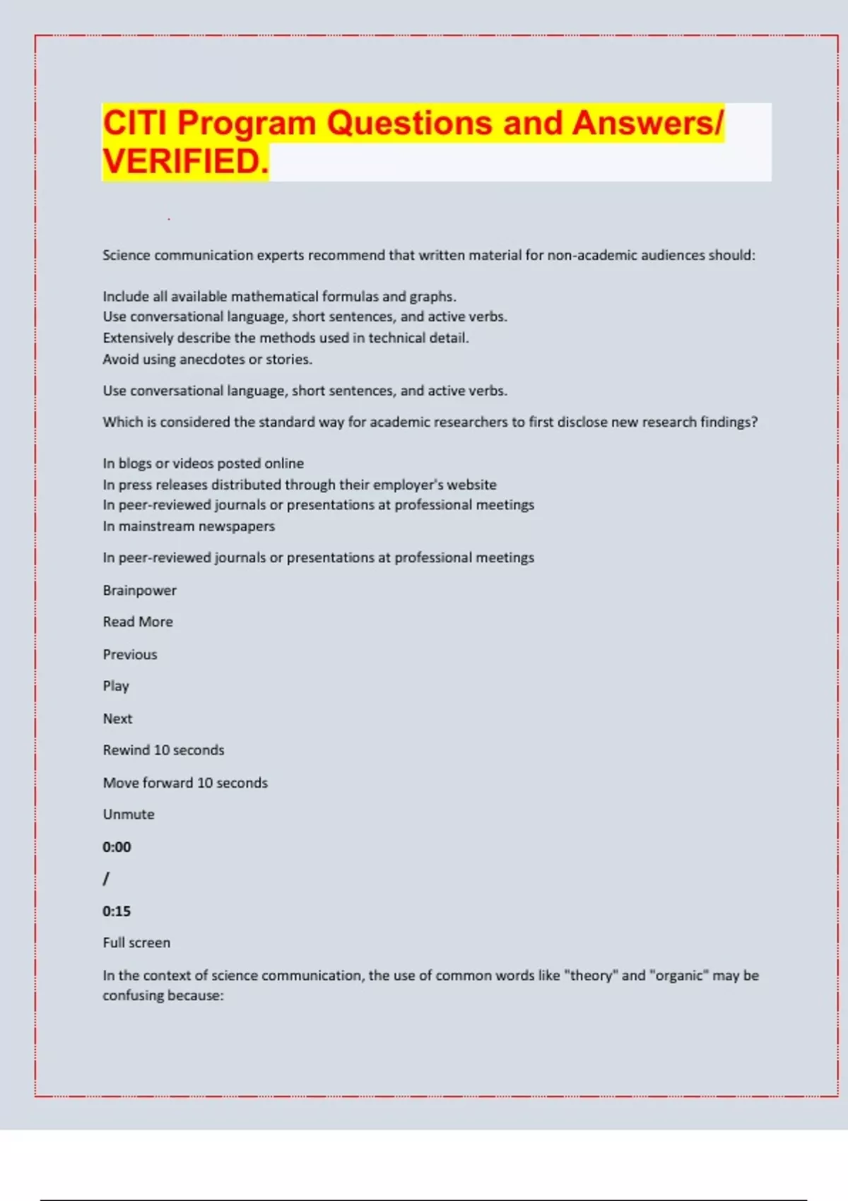 CITI Program Questions and Answers/ VERIFIED. Science communication experts recommend that written material for non-academic audiences should: Include all available mathematical formulas and graphs. Use conversational language, short sentences, and active verbs. Extensively describe the methods used in technical detail. Avoid using anecdotes or stories. Use conversational language, short sentences, and active verbs. Which is considered the standard way for academic researchers to first disclose new research findings? In blogs or videos posted online In press releases distributed through their employer's website In peer-reviewed journals or presentations at professional meetings In mainstream newspapers In peer-reviewed journals or presentations at professional meetings Brainpower Read More Previous Play Next Rewind 10 seconds Move forward 10 seconds Unmute 0:00 / 0:15 Full screen In the context of science communication, the use of common words like "theory" and "organic" may be confusing because: They downplay the significance of scientific findings. They are words not used by the public. They are no longer used in research fields and have been replaced by more modern terms. They can mean different things in science and in everyday conversation. They can mean different things in science and in everyday conversation. Which statement most accurately describes the "deficit model" of science communication? Science organizations can raise money by communicating better Scientists suffer from a deficit in effective communication skills The news media lacks well-informed science coverage Experts provide knowledge to a passive, poorly informed public Experts provide knowledge to a passive, poorly informed public The National Science Foundation (NSF) requires researchers that it funds to provide a non-technical description of their project in order to: Describe and analyze the history of federally funded research in the relevant field. Provide information so that researchers in other disciplines can critique the project. Explain the project's significance and provide a public justification for NSF funding. Enable the research team to more easily protect any intellectual property obtained during the research. Explain the project's significance and provide a public justification for NSF funding. Which of the following most accurately describes a researcher's responsibility to communicate with the public? It is part of an implicit social contract with the public It is a kindness to the public that is unlikely to benefit the individual researcher It is a standard requirement for obtaining tenure at an academic institution It is no longer necessary because of the wealth of information available on the Internet It is part of an implicit social contract with the public Why do science communication experts recommend that speakers minimize use of jargon, the specialized vocabulary of a field, when talking to public audiences? Jargon may be harder for the speaker to pronounce. Jargon can make it harder for some in the audience to understand what is being said. Jargon generally is more acceptable in written material, than in speech. Jargon may be so concise that speakers could be left with extra time. Jargon can make it harder for some in the audience to understand what is being said. Which of the following most accurately describes a case of research misconduct? Image manipulation that results in fabrication of results Image manipulation that was not archived properly Image manipulation that was not fully described in the figure legend or the methods section Image manipulation that results in a difference of opinion by the authors Image manipulation that results in fabrication of results Which of the following most accurately describes why the JPEG file format should be avoided for scientific image data? JPEG is a file format often used by consumer electronics and is therefore unscientific. JPEG is best used to make images smaller for faster loading websi