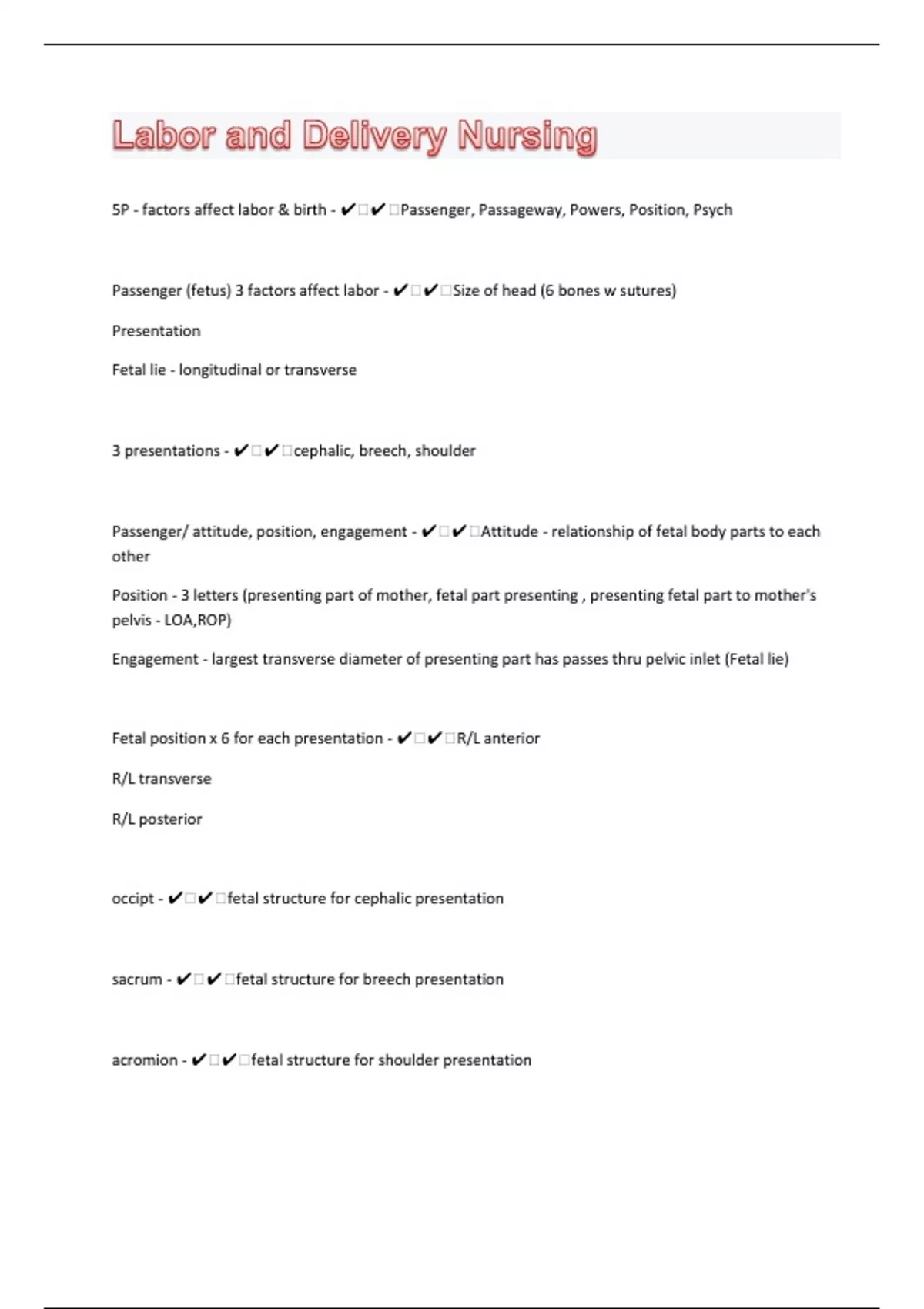 5P - factors affect labor & birth - ️️Passenger, Passageway, Powers, Position, Psych Passenger (fetus) 3 factors affect labor - ️️Size of head (6 bones w sutures) Presentation Fetal lie - longitudinal or transverse 3 presentations - ️️cephalic, breech, shoulder Passenger/ attitude, position, engagement - ️️Attitude - relationship of fetal body parts to each other Position - 3 letters (presenting part of mother, fetal part presenting , presenting fetal part to mother's pelvis - LOA,ROP) Engagement - largest transverse diameter of presenting part has passes thru pelvic inlet (Fetal lie) Fetal position x 6 for each presentation - ️️R/L anterior R/L transverse R/L posterior occipt - ️️fetal structure for cephalic presentation sacrum - ️️fetal structure for breech presentation acromion - ️️fetal structure for shoulder presentation