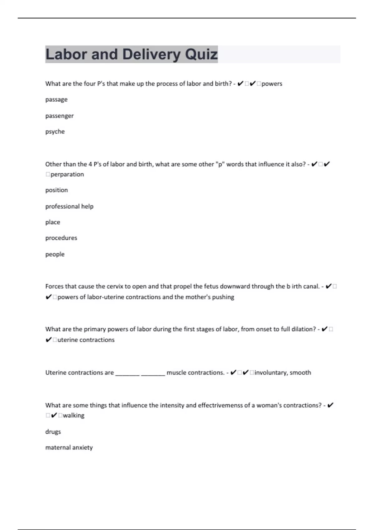 What are the four P's that make up the process of labor and birth? - ️️powers passage passenger psyche Other than the 4 P's of labor and birth, what are some other "p" words that influence it also? - ️️perparation position professional help place procedures people Forces that cause the cervix to open and that propel the fetus downward through the b irth canal. - ️️powers of labor-uterine contractions and the mother's pushing What are the primary powers of labor during the first stages of labor, from onset to full dilation? - ️️uterine contractions Uterine contractions are _______ _______ muscle contractions. - ️️involuntary, smooth What are some things that influence the intensity and effectrivemenss of a woman's contractions? - ️️walking drugs maternal anxiety vaginal examinations