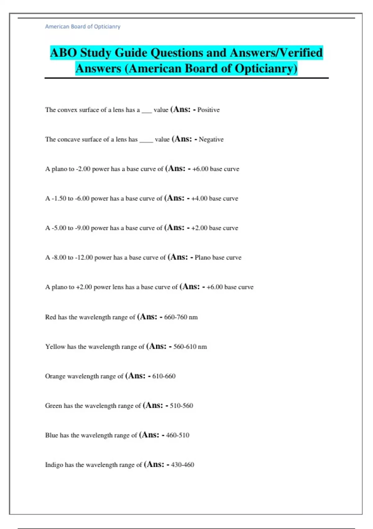 ABO Study Guide Questions and Answers/Verified Answers (American Board of Opticianry) The convex surface of a lens has a ___ value (Ans: - Positive The concave surface of a lens has ____ value (Ans: - Negative A plano to -2.00 power has a base curve of (Ans: - +6.00 base curve