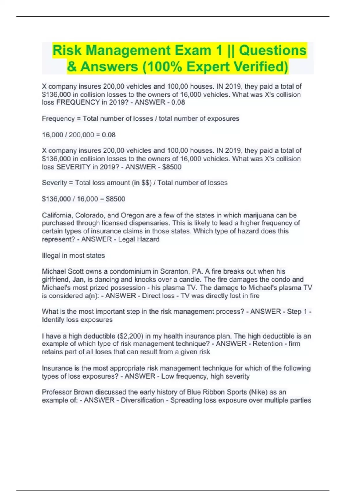 Risk Management Exam 1 || Questions & Answers (100% Expert Verified) Risk Management Exam 1 || Questions & Answers (100% Expert Verified) X company insures 200,00 vehicles and 100,00 houses. IN 2019, they paid a total of $136,000 in collision losses to the owners of 16,000 vehicles. What was X's collision loss FREQUENCY in 2019? - ANSWER - 0.08 Frequency = Total number of losses / total number of exposures 16,000 / 200,000 = 0.08 X company insures 200,00 vehicles and 100,00 houses. IN 2019, they paid a total of $136,000 in collision losses to the owners of 16,000 vehicles. What was X's collision loss SEVERITY in 2019? - ANSWER - $8500 Severity = Total loss amount (in $$) / Total number of losses $136,000 / 16,000 = $8500 California, Colorado, and Oregon are a few of the states in which marijuana can be purchased through licensed dispensaries. This is likely to lead a higher frequency of certain types of insurance claims in those states. Which type of hazard does this represent? - ANSWER - Legal Hazard Illegal in most states Michael Scott owns a condominium in Scranton, PA. A fire breaks out when his girlfriend, Jan, is dancing and knocks over a candle. The fire damages the condo and Michael's most prized possession - his plasma TV. The damage to Michael's plasma TV is considered a(n): - ANSWER - Direct loss - TV was directly lost in fire What is the most important step in the risk management process? - ANSWER - Step 1 - Identify loss exposures I have a high deductible ($2,200) in my health insurance plan. The high deductible is an example of which type of risk management technique? - ANSWER - Retention - firm retains part of all loses that can result from a given risk Insurance is the most appropriate risk management technique for which of the following types of loss exposures? - ANSWER - Low frequency, high severity Professor Brown discussed the early history of Blue Ribbon Sports (Nike) as an example of: - ANSWER - Diversification - Spreading loss exposure over multiple parties