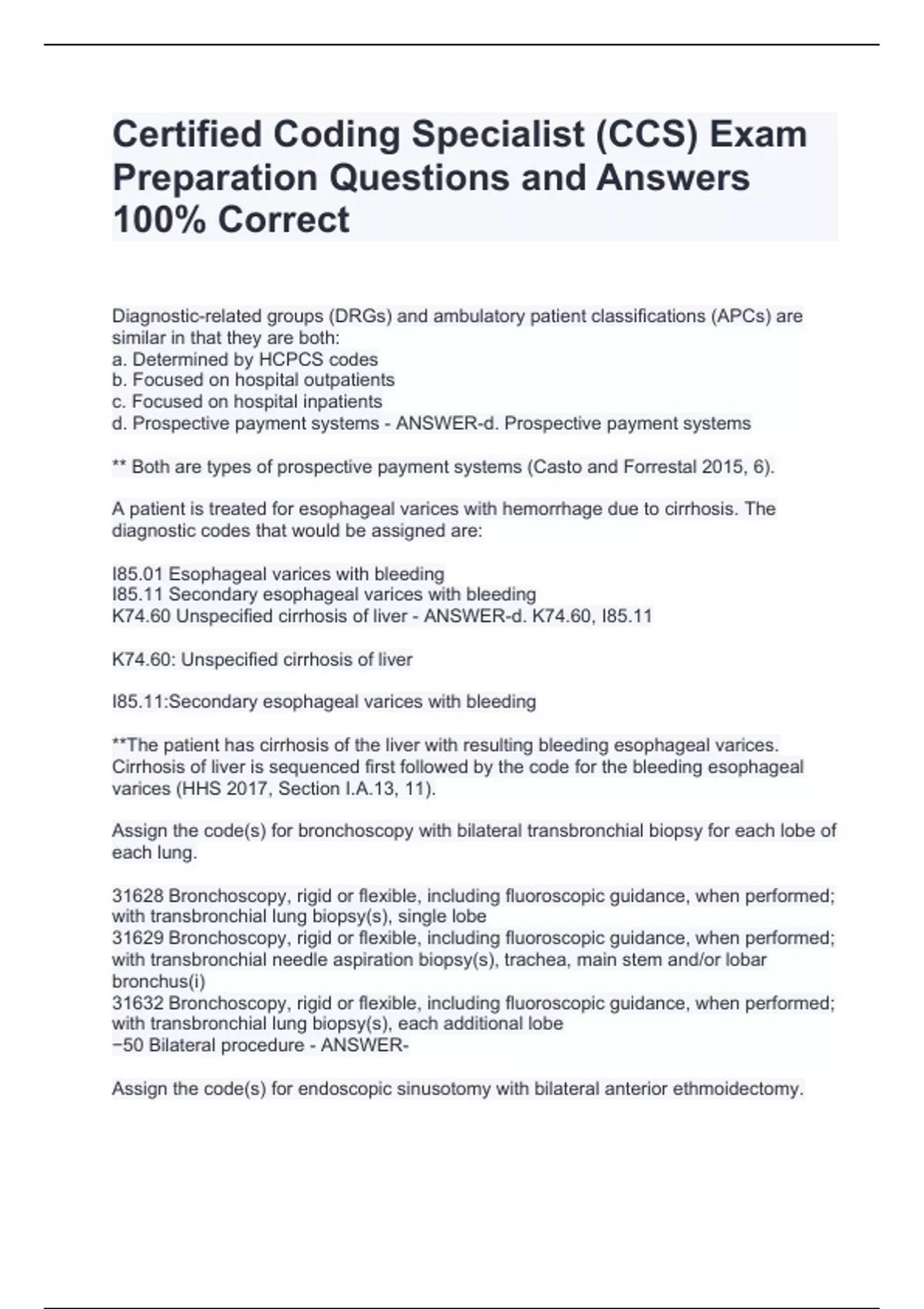 Certified Coding Specialist (CCS) Exam Preparation Questions and Answers 100% CorrectCertified Coding Specialist (CCS) Exam Preparation Questions anCertified Coding Specialist (CCS) Exam Preparation Questions and Answers 100% Correctd Answers 100% Correct Diagnostic-related groups (DRGs) and ambulatory patient classifications (APCs) are similar in that they are both: a. Determined by HCPCS codes b. Focused on hospital outpatients c. Focused on hospital inpatients d. Prospective payment systems - ANSWER-d. Prospective payment systems ** Both are types of prospective payment systems (Casto and Forrestal 2015, 6). A patient is treated for esophageal varices with hemorrhage due to cirrhosis. The diagnostic codes that would be assigned are: