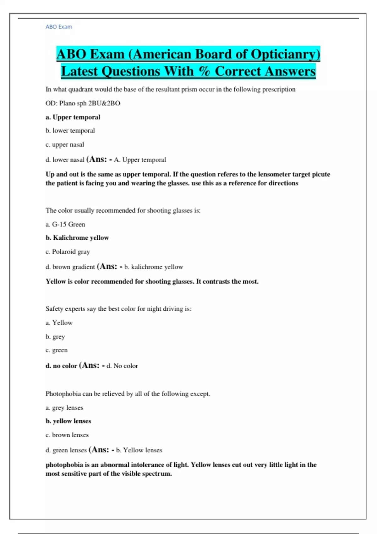ABO Exam (American Board of Opticianry) Latest Questions With % Correct Answers In what quadrant would the base of the resultant prism occur in the following prescription OD: Plano sph 2BU&2BO a. Upper temporal b. lower temporal c. upper nasal d. lower nasal (Ans: - A. Upper temporal Up and out is the same as upper temporal. If the question referes to the lensometer target picute the patient is facing you and wearing the glasses. use this as a reference for directions The color usually recommended for shooting glasses is: a. G-15 Green b. Kalichrome yellow c. Polaroid gray d. brown gradient (Ans: - b. kalichrome yellow Yellow is color recommended for shooting glasses. It contrasts the most. Safety experts say the best color for night driving is: a. Yellow b. grey c. green d. no color (Ans: - d. No color Photophobia can be relieved by all of the following except. a. grey lenses b. yellow lenses c. brown lenses d. green lenses (Ans: - b. Yellow lenses photophobia is an abnormal intolerance of light. Yellow lenses cut out very little light in the most sensitive part of the visible spectrum. The refractive error where rays of light focus in front of the retina is: a. presbyopia a c. hyperopia d. emmetropia (Ans: - b. myopia Presbyopia and hyperopia require plus power. emmetropia is normal vision (no refractive error). Light coming to a focus of the retina indicates too much plus power, or myopia.