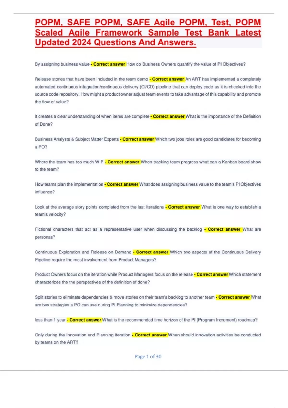 POPM, SAFE POPM, SAFE Agile POPM, Test, POPM Scaled Agile Framework Sample Test Bank Latest Updated 2024 Questions And Answers