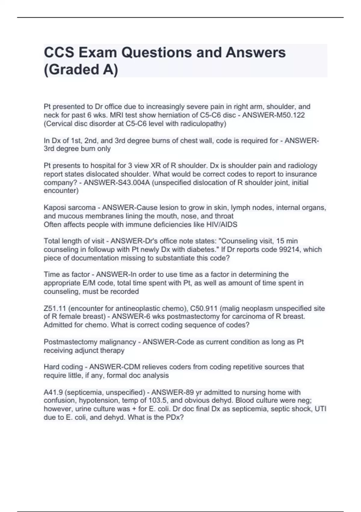 CCS Exam Questions and Answers (Graded A)CCS Exam Questions and Answers (Graded A)CCS Exam Questions and Answers (Graded A)CCS Exam Questions and Answers (Graded A) Pt presented to Dr office due to increasingly severe pain in right arm, shoulder, and neck for past 6 wks. MRI test show herniation of C5-C6 disc - ANSWER-M50.122 (Cervical disc disorder at C5-C6 level with radiculopathy) In Dx of 1st, 2nd, and 3rd degree burns of chest wall, code is required for - ANSWER-3rd degree burn only Pt presents to hospital for 3 view XR of R shoulder. Dx is shoulder pain and radiology report states dislocated shoulder. What would be correct codes to report to insurance company? - ANSWER-S43.004A (unspecified dislocation of R shoulder joint, initial encounter) Kaposi sarcoma - ANSWER-Cause lesion to grow in skin, lymph nodes, internal organs, and mucous membranes lining the mouth, nose, and throat