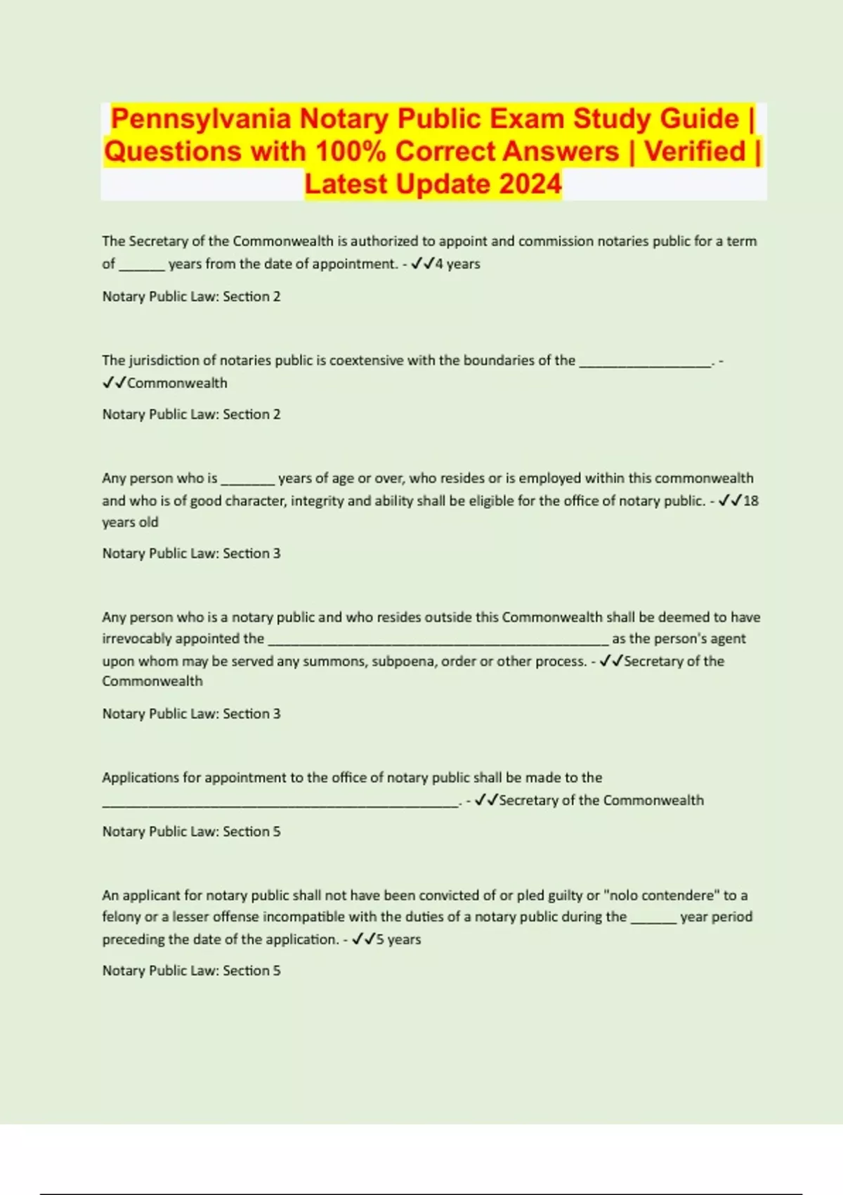 Pennsylvania Notary Public Exam Study Guide | Questions with 100% Correct Answers | Verified | Latest Update 2024