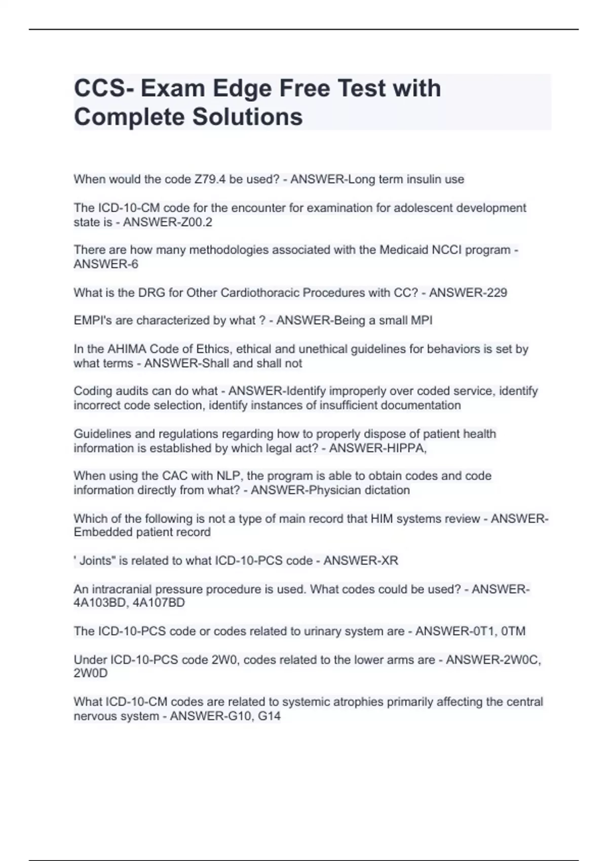 CCS- Exam Edge FreeCCS- Exam Edge Free Test with Complete SolutionsCCS- Exam Edge Free Test with Complete SolutionsTest with Complete Solutions When would the code Z79.4 be used? - ANSWER-Long term insulin use The ICD-10-CM code for the encounter for examination for adolescent development state is - ANSWER-Z00.2 There are how many methodologies associated with the Medicaid NCCI program - ANSWER-6 What is the DRG for Other Cardiothoracic Procedures with CC? - ANSWER-229