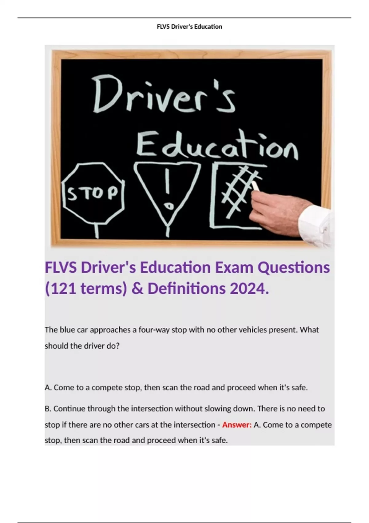 FLVS Driver's Education Exam Questions (121 terms) & Definitions 2024.