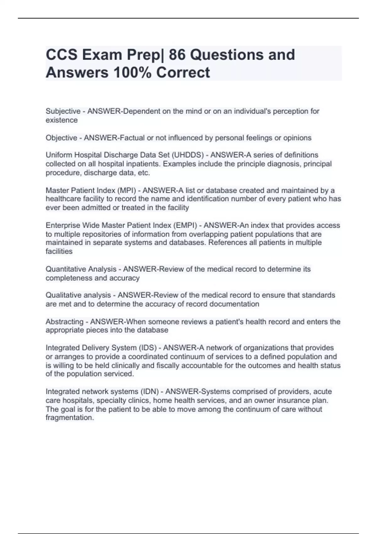CCS Exam Prep| 86 Questions and Answers 100% Correct CCS Exam Prep| 86 Questions and Answers 100% Correct CCS Exam Prep| 86 Questions and Answers 100% Correct CCS Exam Prep| 86 Questions and Answers 100% Correct Subjective - ANSWER-Dependent on the mind or on an individual's perception for existence Objective - ANSWER-Factual or not influenced by personal feelings or opinions Uniform Hospital Discharge Data Set (UHDDS) - ANSWER-A series of definitions collected on all hospital inpatients. Examples include the principle diagnosis, principal procedure, discharge data, etc. Master Patient Index (MPI) - ANSWER-A list or database created and maintained by a healthcare facility to record the name and identification number of every patient who has ever been admitted or treated in the facility
