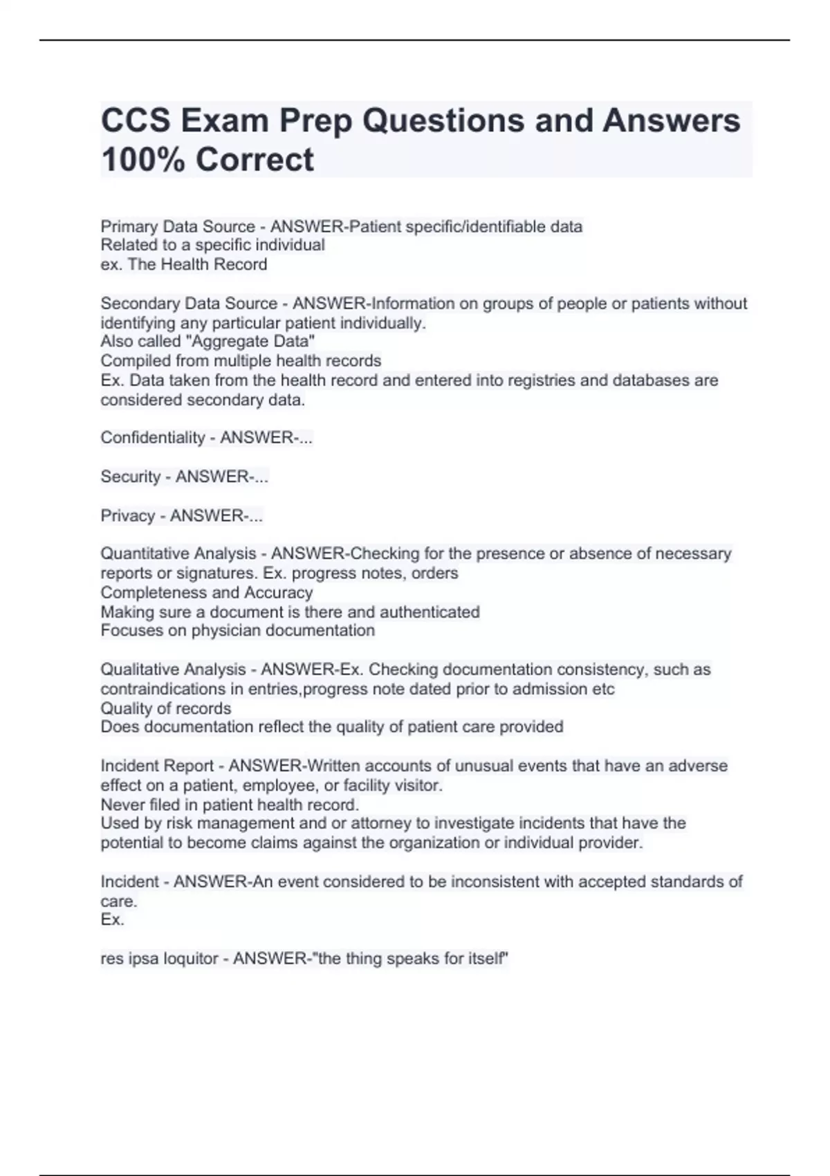CCS Exam Prep Questions and Answers 100% CorrectCCS Exam Prep Questions and Answers 100% CorrectCCS Exam Prep Questions and Answers 100% CorrectCCS Exam Prep Questions and Answers 100% Correct Primary Data Source - ANSWER-Patient specific/identifiable data Related to a specific individual ex. The Health Record Secondary Data Source - ANSWER-Information on groups of people or patients without identifying any particular patient individually. Also called "Aggregate Data" Compiled from multiple health records Ex. Data taken from the health record and entered into registries and databases are considered secondary data. Confidentiality - ANSWER-... Security - ANSWER-... Privacy - ANSWER-...