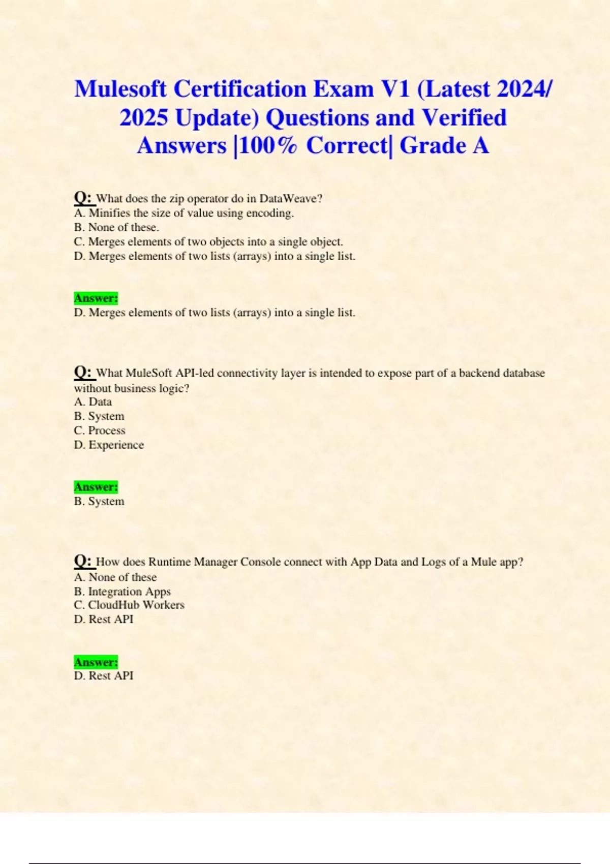 MuleSoft Certification Exam V1 (Latest 2024/ 2025 Update) Questions and Verified Answers |100% Correct| Grade A Q: What does the zip operator do in DataWeave? A. Minifies the size of value using encoding. B. None of these. C. Merges elements of two objects into a single object. D. Merges elements of two lists (arrays) into a single list. Answer: D. Merges elements of two lists (arrays) into a single list. Q: What MuleSoft API-led connectivity layer is intended to expose part of a backend database without business logic? A. Data B. System C. Process D. Experience Answer: B. System Q: How does Runtime Manager Console connect with App Data and Logs of a Mule app? A. None of these B. Integration Apps C. CloudHub Workers D. Rest API Answer: D. Rest API Q: Where does a deployed flow designer application run in Anypoint Platform? A. CloudHub worker B. API Manager C. Design Center D. Exchange Answer: A. CloudHub worker Q: What is the minimum required configuration in a flow for a Mule application to compile? A. An event source B. RAML file C. An event processor D. Logger Component Answer: C. An event processor Q: Does a root element need when creating a response using Dataweave? A. None of these B. Sometimes C. Never D. Always Answer: B. Sometimes Q: What does the minus operator do in DataWeave? A. Decrements the value by one. B. Removes items from a list. C. Increments the value by one. D. Removes characters from a string. Answer: B. Removes items from a list. Q: What module and operation will throw an error if a Mule event's payload is not a number? A. Validation module's Is number operation B. Filter module's Is number operation C. None of these D. Validation module's Is not a number operation Answer: A. Validation module's Is number operation Q: A Set Variable component saves the current payload to a variable.What is the DataWeave parent expression to access the variable? A. #[value] B. #[vars] C. #[var] D. #[values] Answer: B. #[vars] Q: A Batch Job scope has three batch steps. An event processor throws an error in the second batch step because the input data is incomplete.What is the default behavior of the batch job after the error is thrown? A. All processing of the batch job stops. B. None of these. C. Error is ignored. D. Event processing continues to the next batch step. Answer: A. All processing of the batch job stops. Q: Which keyword do you use to create a new function in DataWeave? A. function B. fun