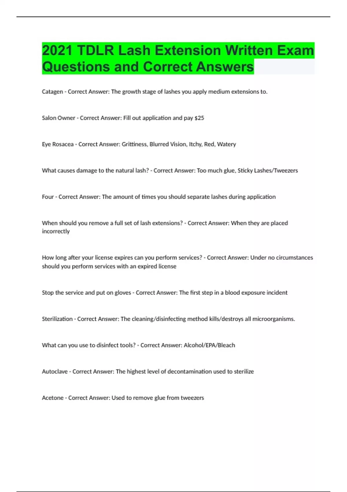2021 TDLR Lash Extension Written Exam Questions and Correct Answers