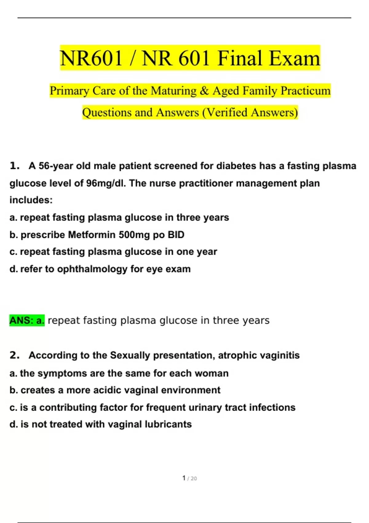 NR601 / NR 601 Final Exam Qs & Ans (Latest 2024 / 2025) : Primary Care of the Maturing & Aged Family Practicum (Verified Answers)