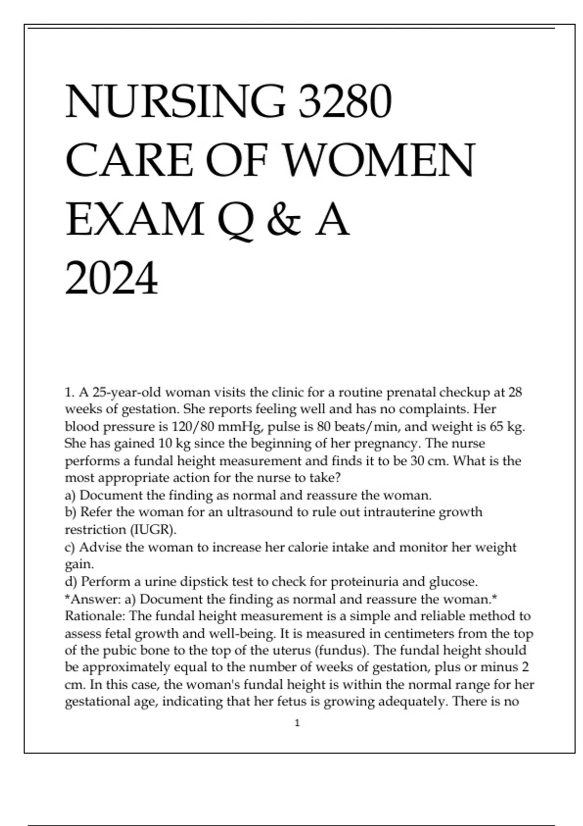 NURSING 3280 CARE OF WOMEN EXAM Q & A 2024.