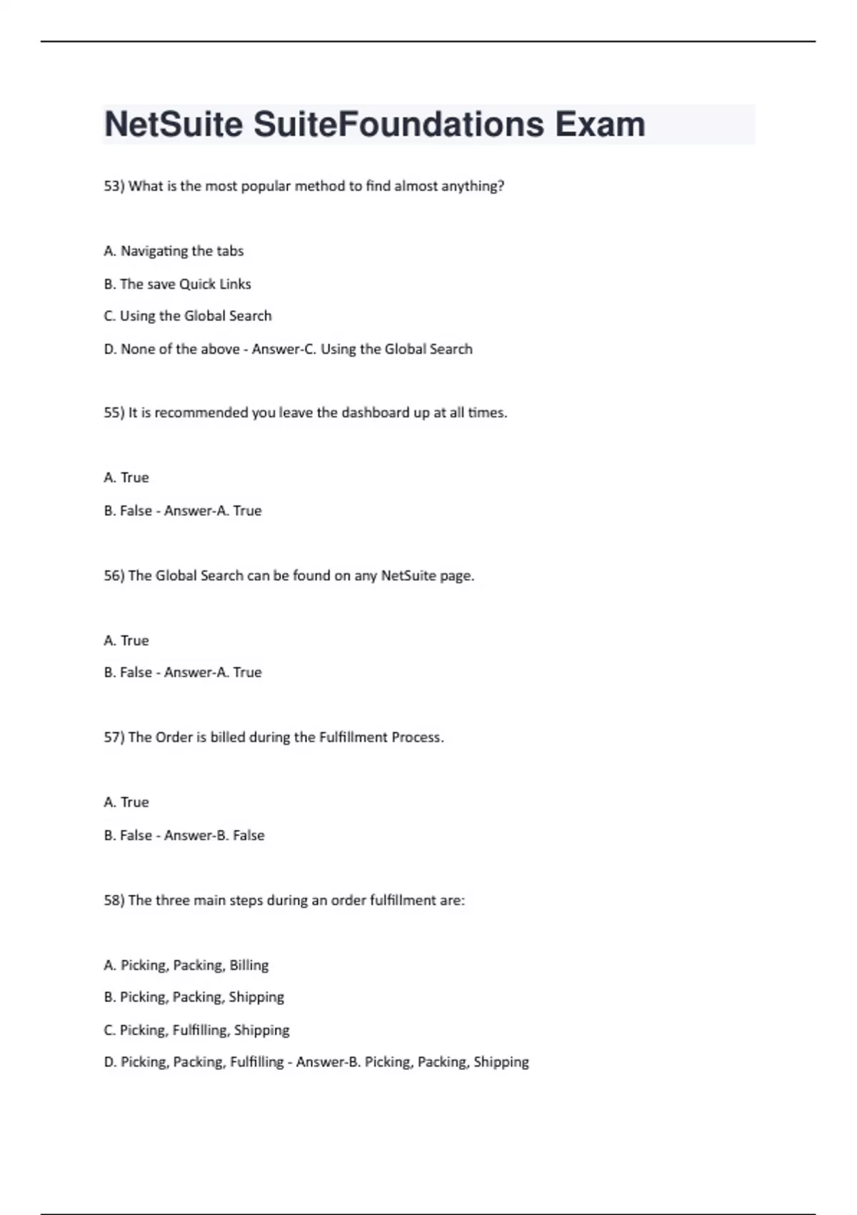 53) What is the most popular method to find almost anything? A. Navigating the tabs B. The save Quick Links C. Using the Global Search D. None of the above - Answer-C. Using the Global Search 55) It is recommended you leave the dashboard up at all times. A. True B. False - Answer-A. True 56) The Global Search can be found on any NetSuite page. A. True B. False - Answer-A. True 57) The Order is billed during the Fulfillment Process. A. True B. False - Answer-B. False 58) The three main steps during an order fulfillment are: A. Picking, Packing, Billing B. Picking, Packing, Shipping C. Picking, Fulfilling, Shipping D. Picking, Packing, Fulfilling - Answer-B. Picking, Packing, Shipping59) A customer receives an email with the tracking information when the order has been marked Shipped . A. True B. False - Answer-A. True 60) What is the best way to search for a customer in a sales order if you do not know their customer number? A. Using the Zip Code B. Using the Full Name and Zip Code C. Using the First and Last Name D. Using the Last Name and Zip Code - Answer-D. Using the Last Name and Zip Code 61) How many ways were described in the PowerPoint to bring up a new sales order? A. Two B. Three C. Four D. Five - Answer-A. Two