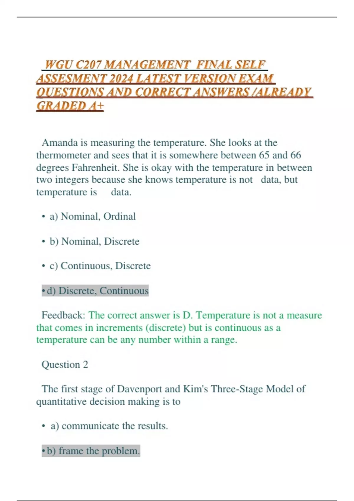 WGU C207 MANAGEMENT FINAL SELF ASSESMENT 2024 LATEST VERSION EXAM QUESTIONS AND CORRECT ANSWERS /ALREADY GRADED A+