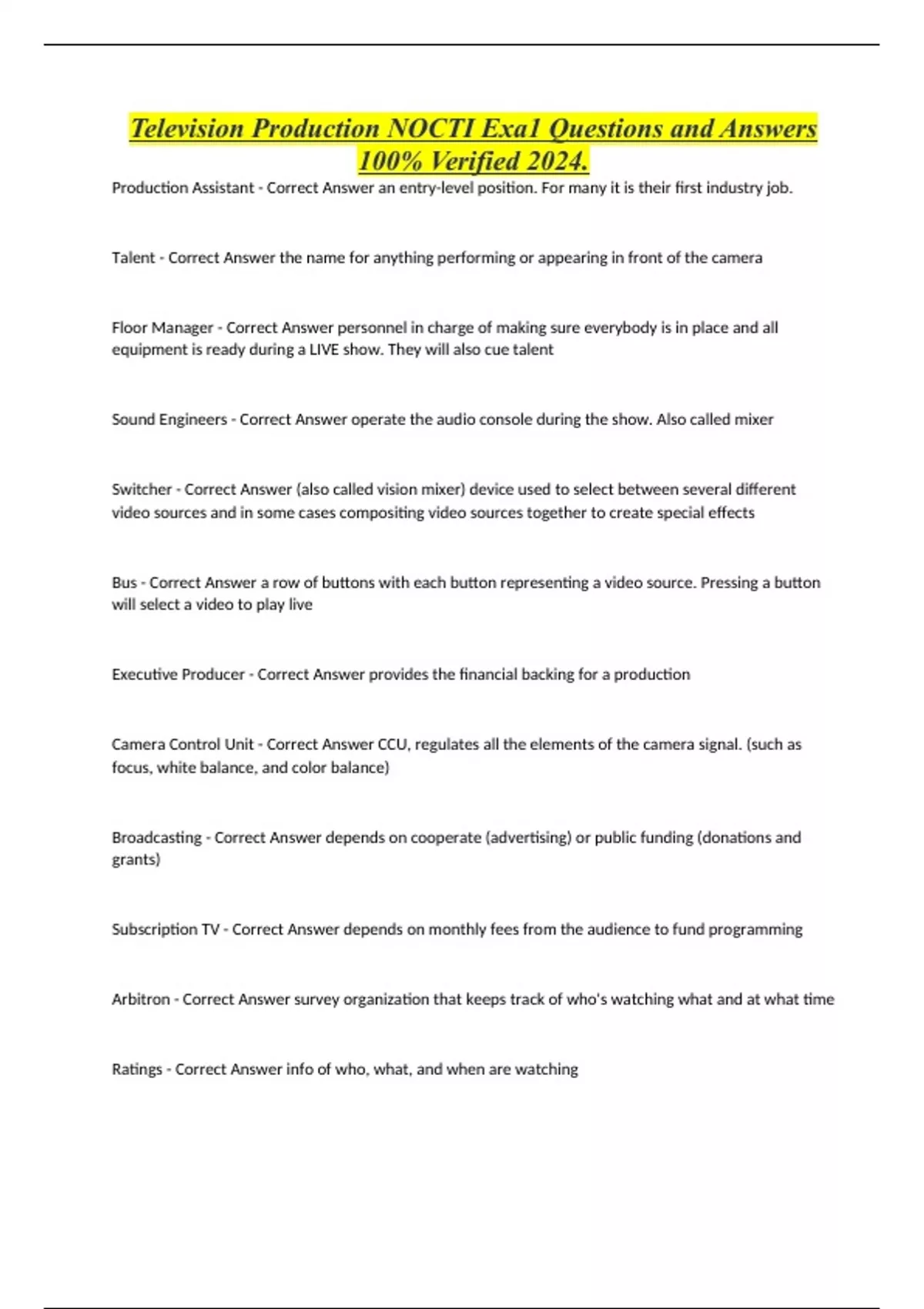 Television Production NOCTI Exa1 Questions and Answers 100% Verified 2024. Production Assistant - Correct Answer an entry-level position. For many it is their first industry job. Talent - Correct Answer the name for anything performing or appearing in front of the camera Floor Manager - Correct Answer personnel in charge of making sure everybody is in place and all equipment is ready during a LIVE show. They will also cue talent Sound Engineers - Correct Answer operate the audio console during the show. Also called mixer Switcher - Correct Answer (also called vision mixer) device used to select between several different video sources and in some cases compositing video sources together to create special effects Bus - Correct Answer a row of buttons with each button representing a video source. Pressing a button will select a video to play live Executive Producer - Correct Answer provides the financial backing for a production Camera Control Unit - Correct Answer CCU, regulates all the elements of the camera signal. (such as focus, white balance, and color balance) Broadcasting - Correct Answer depends on cooperate (advertising) or public funding (donations and grants) Subscription TV - Correct Answer depends on monthly fees from the audience to fund programming Arbitron - Correct Answer survey organization that keeps track of who's watching what and at what time Ratings - Correct Answer info of who, what, and when are watching