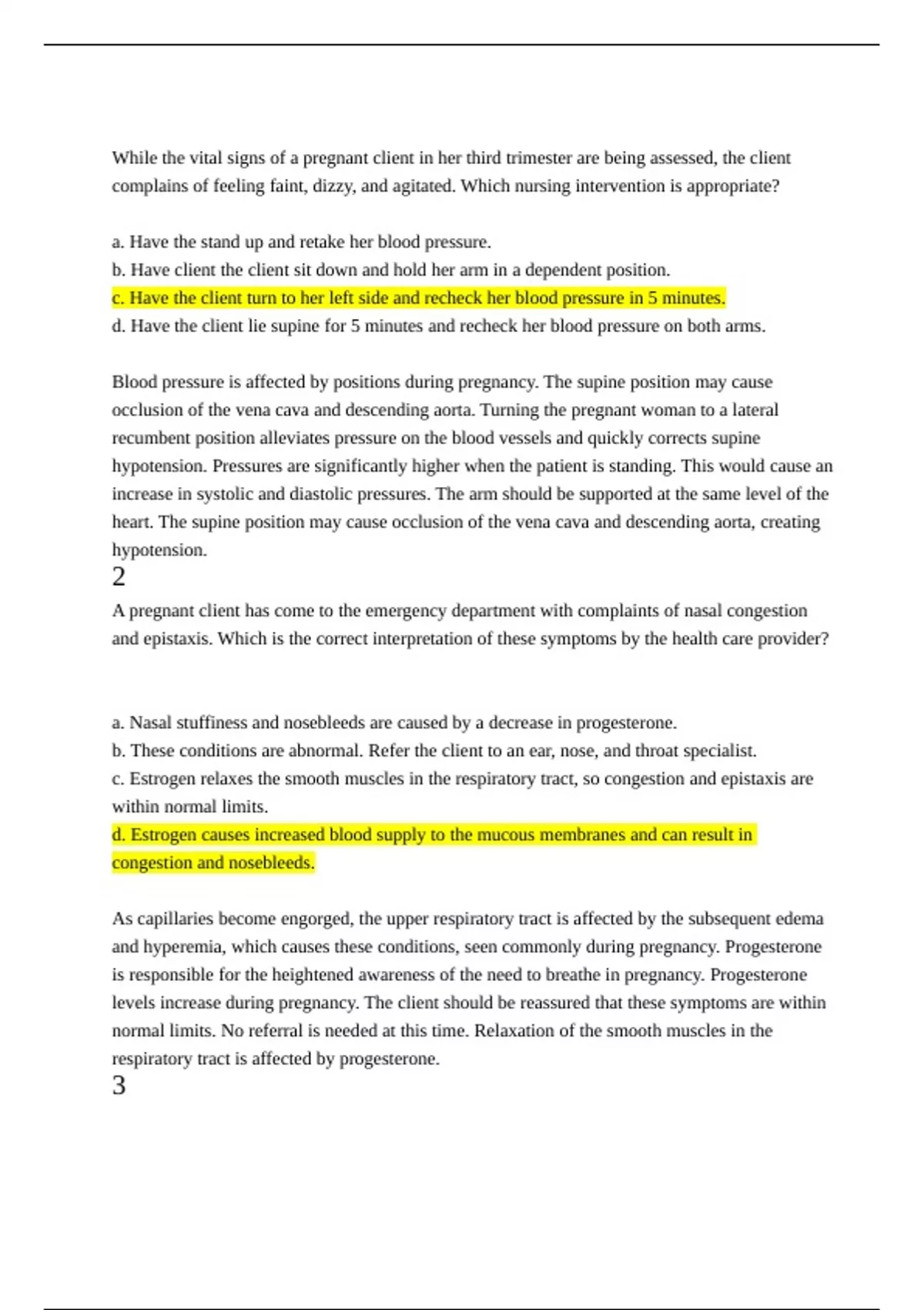 While the vital signs of a pregnant client in her third trimester are being assessed, the client complains of feeling faint, dizzy, and agitated. Which nursing intervention is appropriate? a. Have the stand up and retake her blood pressure. b. Have client the client sit down and hold her arm in a dependent position. c. Have the client turn to her left side and recheck her blood pressure in 5 minutes. d. Have the client lie supine for 5 minutes and recheck her blood pressure on both arms. Blood pressure is affected by positions during pregnancy. The supine position may cause occlusion of the vena cava and descending aorta. Turning the pregnant woman to a lateral recumbent position alleviates pressure on the blood vessels and quickly corrects supine hypotension. Pressures are significantly higher when the patient is standing. This would cause an increase in systolic and diastolic pressures. The arm should be supported at the same level of the heart. The supine position may cause occlusion of the vena cava and descending aorta, creating hypotension. 2 A pregnant client has come to the emergency department with complaints of nasal congestion and epistaxis. Which is the correct interpretation of these symptoms by the health care provider? a. Nasal stuffiness and nosebleeds are caused by a decrease in progesterone. b. These conditions are abnormal. Refer the client to an ear, nose, and throat specialist. c. Estrogen relaxes the smooth muscles in the respiratory tract, so congestion and epistaxis are within normal limits. d. Estrogen causes increased blood supply to the mucous membranes and can result in congestion and nosebleeds. As capillaries become engorged, the upper respiratory tract is affected by the subsequent edema and hyperemia, which causes these conditions, seen commonly during pregnancy. Progesterone is responsible for the heightened awareness of the need to breathe in pregnancy. Progesterone levels increase during pregnancy. The client should be reassured that these symptoms are within normal limits. No referral is needed at this time. Relaxation of the smooth muscles in the respiratory tract is affected by progesterone. 3 Which suggestion is appropriate for the pregnant client who is experiencing heartburn? a. Drink plenty of fluids at bedtime. b. Eat only three meals a day so the stomach is empty between meals. c. Drink coffee or orange juice immediately on arising in the morning. d. Use Tums or Alkamints to obtain relief, as directed by the health care provider. Antacids high in calcium (e.g., Tums, Alkamints) can provide temporary relief. Fluids overstretch the stomach and may precipitate reflux when lying down. Instruct the woman to eat five or six small meals per day rather than three full meals. Coffee and orange juice stimulate acid formation in the stomach. 4 While providing education to a primiparous client regarding the normal changes of pregnancy, what is important for the nurse to explain about Braxton Hicks contractions? a. These contractions may indicate preterm labor. b. These are contractions that never cause any discomfort. c. Braxton Hicks contractions only start during the third trimester. d. These occur throughout pregnancy, but you may not feel them until the third trimester. Throughout pregnancy, the uterus undergoes irregular contractions called Braxton Hicks contractions. During the first two trimesters, the contractions are infrequent and usually not felt by the woman until the third trimester. Braxton Hicks contractions do not indicate preterm labor. Braxton Hicks contractions can cause some discomfort, especially in the third trimester. Braxton Hicks contractions occur throughout the whole pregnancy. 5 What is the reason for vascular volume increasing by 40% to 60% during pregnancy? a. Prevents maternal and fetal dehydration b. Eliminates metabolic wastes of the mother c. Provides adequate perfusion of the placenta d. Compensates for decreased renal plasma flow The primary function of increased vascular volume is to transport oxygen and nutrients to the fetus via the placenta. Preventing maternal and fetal dehydration is not the primary reason for the increase in volume. Assisting with pulling metabolic wastes from the fetus for maternal excretion is one purpose of the increased vascular volume. Renal plasma flow increases during pregnancy. 6 Physiologic anemia often occurs during pregnancy because of: a. inadequate intake of iron. b. the fetus establishing iron stores. c. dilution of hemoglobin concentration. d. decreased production of erythrocytes. When blood volume expansion is more pronounced and occurs earlier than the increase in red blood cells, the woman will have physiologic anemia, which is the result of dilution of hemoglobin concentration rather than inadequate hemoglobin. Inadequate intake of iron may lead to true anemia. If the woman does not take an adequate amount of iron, true anemia may occur when the fetus pulls stored iron from the maternal system. There is increased production of erythrocytes during pregnancy. 7 A client is currently pregnant; she has a 5-year-old son and a 3-year-old daughter. She had one other pregnancy that terminated at 8 weeks. Which are her gravida and para? a. 3, 2 b. 4, 3 c. 4, 2 d. 3, 3 She has had four pregnancies, including the current one (gravida 4). She had two pregnancies that terminated after 20 weeks (para 2). The pregnancy that terminated at 8 weeks is classified as an abortion. Because she is currently pregnant, she is classified as a gravida 4. Gravida 4 is correct, but she is para 2; the pregnancy that was terminated at 8 weeks is classified as an abortion. Because she is currently pregnant, she would be classified as a gravida 4, not 3. 8 A client’s last menstrual period was June 10. What is her estimated date of birth (EDD)? a. April 7 b. March 17 c. March 27 d. April 17 To determine the EDD, the nurse use