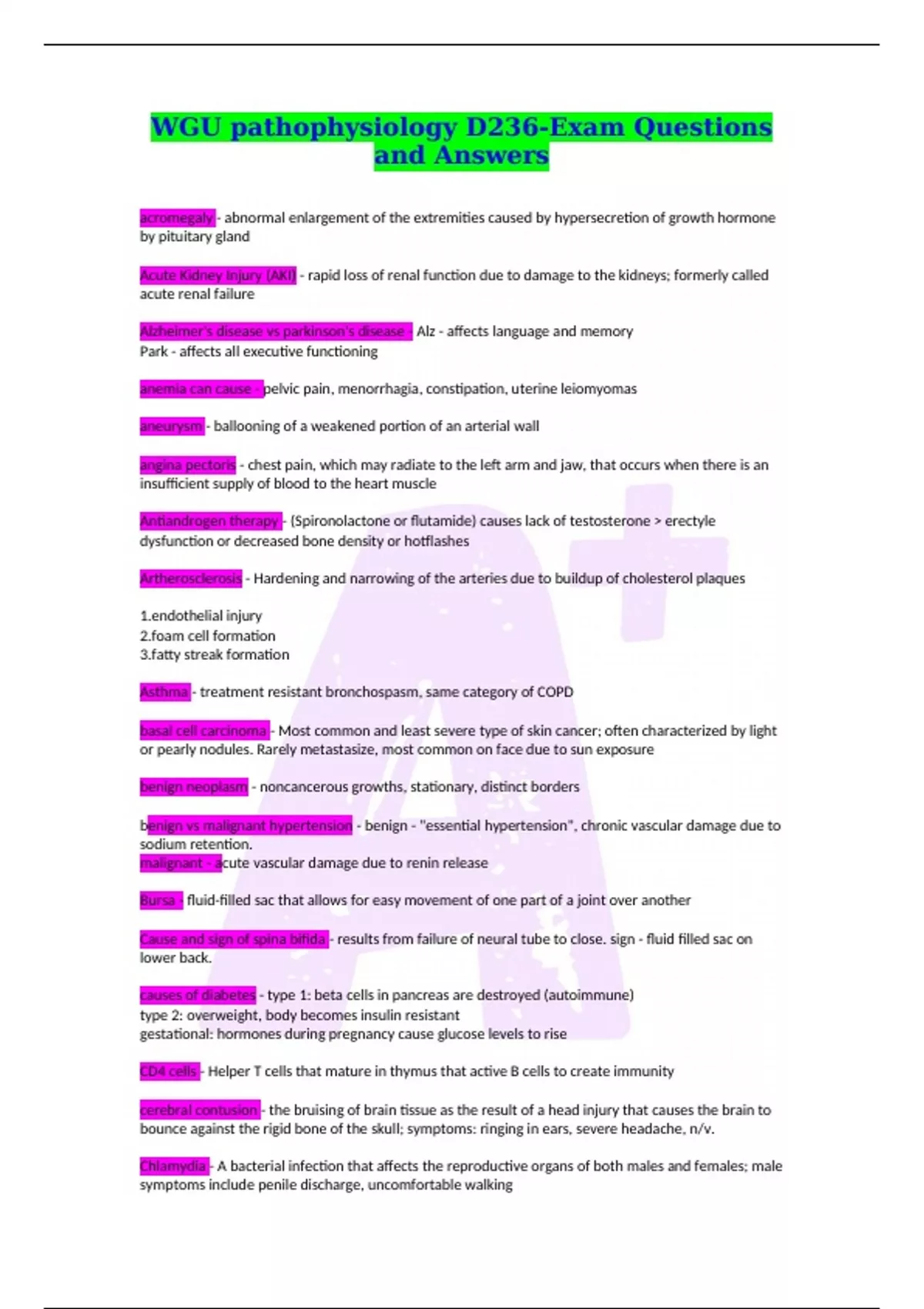 acromegaly - abnormal enlargement of the extremities caused by hypersecretion of growth hormone by pituitary gland Acute Kidney Injury (AKI) - rapid loss of renal function due to damage to the kidneys; formerly called acute renal failure Alzheimer's disease vs parkinson's disease - Alz - affects language and memory Park - affects all executive functioning anemia can cause - pelvic pain, menorrhagia, constipation, uterine leiomyomas aneurysm - ballooning of a weakened portion of an arterial wall angina pectoris - chest pain, which may radiate to the left arm and jaw, that occurs when there is an insufficient supply of blood to the heart muscle Antiandrogen therapy - (Spironolactone or flutamide) causes lack of testosterone > erectyle dysfunction or decreased bone density or hotflashes Artherosclerosis - Hardening and narrowing of the arteries due to buildup of cholesterol plaques helial injury cell formation streak formation Asthma - treatment resistant bronchospasm, same category of COPD basal cell carcinoma - Most common and least severe type of skin cancer; often characterized by light or pearly nodules. Rarely metastasize, most common on face due to sun exposure benign neoplasm - noncancerous growths, stationary, distinct borders benign vs malignant hypertension - benign - "essential hypertension", chronic vascular damage due to sodium retention. malignant - acute vascular damage due to renin release Bursa - fluid-filled sac that allows for easy movement of one part of a joint over another Cause and sign of spina bifida - results from failure of neural tube to close. sign - fluid filled sac on lower back. causes of diabetes - type 1: beta cells in pancreas are destroyed (autoimmune) type 2: overweight, body becomes insulin resistant gestational: hormones during pregnancy cause glucose levels to rise CD4 cells - Helper T cells that mature in thymus that active B cells to create immunity cerebral contusion - the bruising of brain tissue as the result of a head injury that causes the brain to bounce against the rigid bone of the skull; symptoms: ringing in ears, severe headache, n/v.