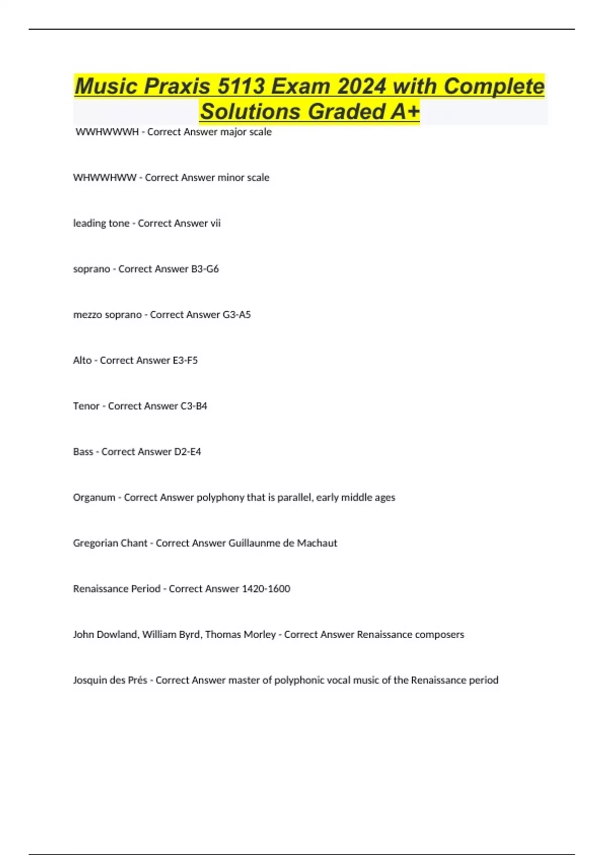 Music Praxis 5113 Exam 2024 with Complete Solutions Graded A+ WWHWWWH - Correct Answer major scale WHWWHWW - Correct Answer minor scale leading tone - Correct Answer vii soprano - Correct Answer B3-G6 mezzo soprano - Correct Answer G3-A5 Alto - Correct Answer E3-F5 Tenor - Correct Answer C3-B4 Bass - Correct Answer D2-E4 Organum - Correct Answer polyphony that is parallel, early middle ages Gregorian Chant - Correct Answer Guillaunme de Machaut Renaissance Period - Correct Answer John Dowland, William Byrd, Thomas Morley - Correct Answer Renaissance composers Josquin des Prés - Correct Answer master of polyphonic vocal music of the Renaissance period motet - Correct Answer vocal composition of Ren
