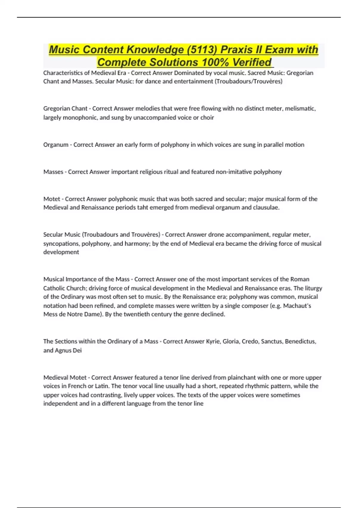 Music Content Knowledge (5113) Praxis II Exam with Complete Solutions 100% Verified Characteristics of Medieval Era - Correct Answer Dominated by vocal music. Sacred Music: Gregorian Chant and Masses. Secular Music: for dance and entertainment (Troubadours/Trouvères) Gregorian Chant - Correct Answer melodies that were free flowing with no distinct meter, melismatic, largely monophonic, and sung by unaccompanied voice or choir Organum - Correct Answer an early form of polyphony in which voices are sung in parallel motion Masses - Correct Answer important religious ritual and featured non-imitative polyphony Motet - Correct Answer polyphonic music that was both sacred and secular; major musical form of the Medieval and Renaissance periods taht emerged from medieval organum and clausulae. Secular Music (Troubadours and Trouvères) - Correct Answer drone accompaniment, regular meter, syncopations, polyphony, and harmony; by the end of Medieval era became the driving force of musical development Musical Importance of the Mass - Correct Answer one of the most important services of the Roman Catholic Church; driving force of musical development in the Medieval and Renaissance eras. The liturgy of the Ordinary was most often set to music. By the Renaissance era; polyphony was common, musical notation had been refined, and complete masses were written by a single composer (e.g. Machaut's Mess de Notre Dame). By the twentieth century the genre declined. The Sections within the Ordinary of a Mass - Correct Answer Kyrie, Gloria, Credo, Sanctus, Benedictus, and Agnus Dei Medieval Motet - Correct Answer featured a tenor line derived from plainchant with one or more upper voices in French or Latin. The tenor vocal line usually had a short, repeated rhythmic pattern, while the upper voices had contrasting, lively upper voices. The texts of the upper voices were sometimes independent and in a different language from the tenor line