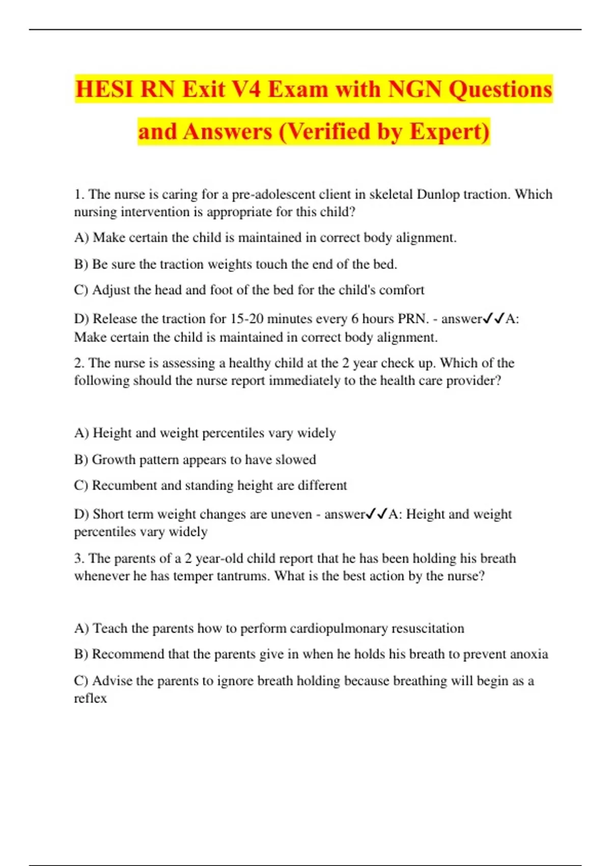 HESI RN Exit V4 Exam with NGN Questions and Answers (Verified by Expert) 1. The nurse is caring for a pre-adolescent client in skeletal Dunlop traction. Which nursing intervention is appropriate for this child? A) Make certain the child is maintained in correct body alignment. B) Be sure the traction weights touch the end of the bed. C) Adjust the head and foot of the bed for the child's comfort D) Release the traction for 15-20 minutes every 6 hours PRN. - answerA: Make certain the child is maintained in correct body alignment. 2. The nurse is assessing a healthy child at the 2 year check up. Which of the following should the nurse report immediately to the health care provider? A) Height and weight percentiles vary widely B) Growth pattern appears to have slowed C) Recumbent and standing height are different D) Short term weight changes are uneven - answerA: Height and weight percentiles vary widely 3. The parents of a 2 year-old child report that he has been holding his breath whenever he has temper tantrums. What is the best action by the nurse? A) Teach the parents how to perform cardiopulmonary resuscitation B) Recommend that the parents give in when he holds his breath to prevent anoxia C) Advise the parents to ignore breath holding because breathing will begin as a reflex D) Instruct the parents on how to reason with the child about possible harmful effects - answerC: Advise the parents to ignore breath holding because breathing will begin as a reflex 4. The nurse is assessing a client in the emergency room. Which statement suggests that the problem is acute angina? A) "My pain is deep in my chest behind my sternum." B) "When I sit up the pain gets worse." C) "As I take a deep breath the pain gets worse." D) "The pain is right here in my stomach area." - answerA: "My pain is deep in my chest behind my sternum." 5. The nurse is assessing the mental status of a client admitted with possible organic brain disorder. Which of these questions will best assess the function of the client's recent memory? A) "Name the year." "What season is this?" (pause for answer after each question) B) "Subtract 7 from 100 and then subtract 7 from that." (pause for answer) "Now continue to subtract 7 from the new number." C) "I am going to say the names of three things and I want you to repeat them after me: blue, ball, pen." D) "What is this on my wrist?" (point to your watch) Then ask, "What is the purpose of it?" - answerC: "I am going to say the names of three things and I want you to repeat them after me: blue, ball, pen." 6. In planning care for a 6 month-old infant, what must the nurse provide to assist in the development of trust? A) Food B) Warmth C) Security D) Comfort - answerC: Securi