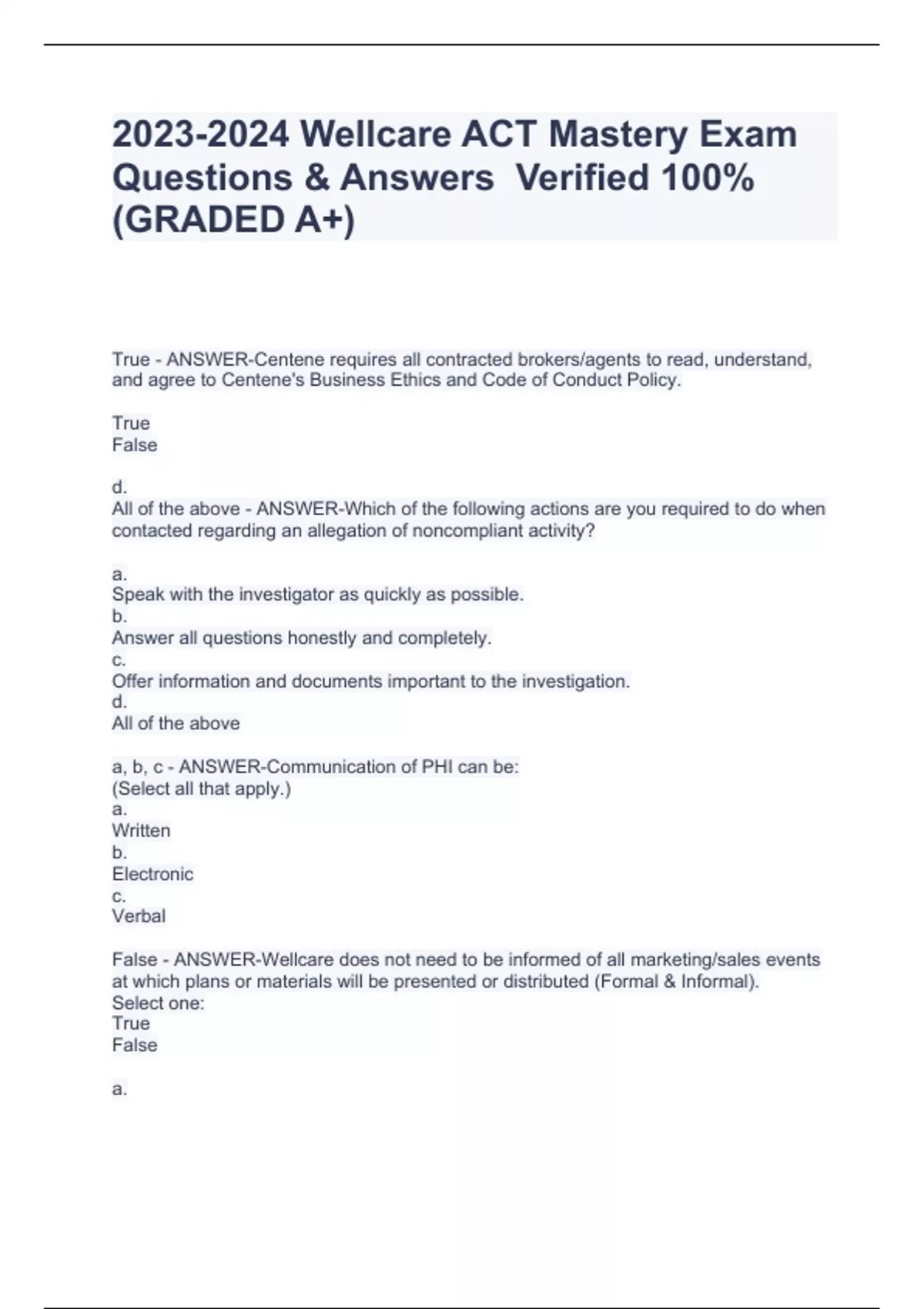 Wellcare ACT Mastery Exam Questions & Answers Verified 100%(GRADED A+) Wellcare ACT Mastery Exam Questions & Answers Verified 100%(GRADED A+) Wellcare ACT Mastery Exam Questions & Answers Verified 100%(GRADED A+) Wellcare ACT Mastery Exam Questions & Answers Verified 100%(GRADED A+)