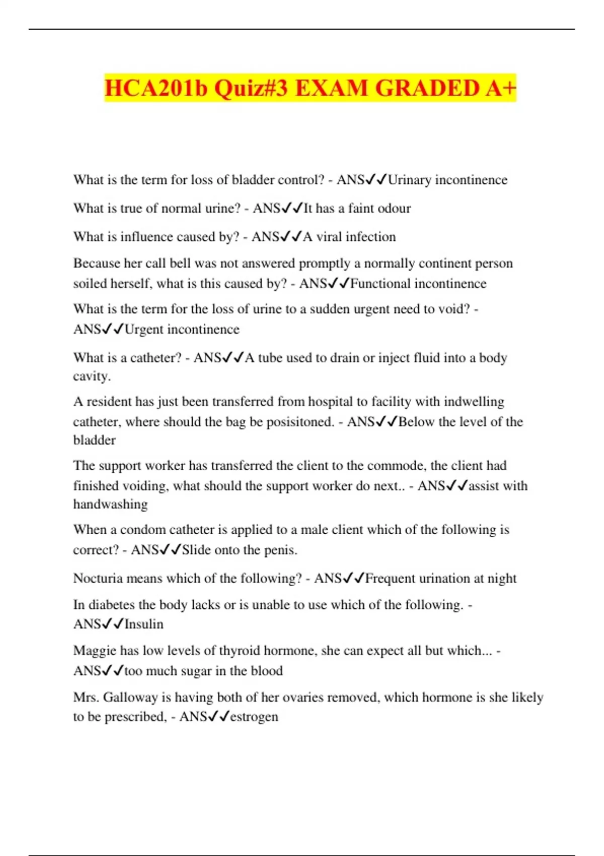 HCA201b Quiz#3 EXAM GRADED A+ What is the term for loss of bladder control? - ANSUrinary incontinence What is true of normal urine? - ANSIt has a faint odour What is influence caused by? - ANSA viral infection Because her call bell was not answered promptly a normally continent person soiled herself, what is this caused by? - ANSFunctional incontinence What is the term for the loss of urine to a sudden urgent need to void? - ANSUrgent incontinence What is a catheter? - ANSA tube used to drain or inject fluid into a body cavity. A resident has just been transferred from hospital to facility with indwelling catheter, where should the bag be posisitoned. - ANSBelow the level of the bladder
