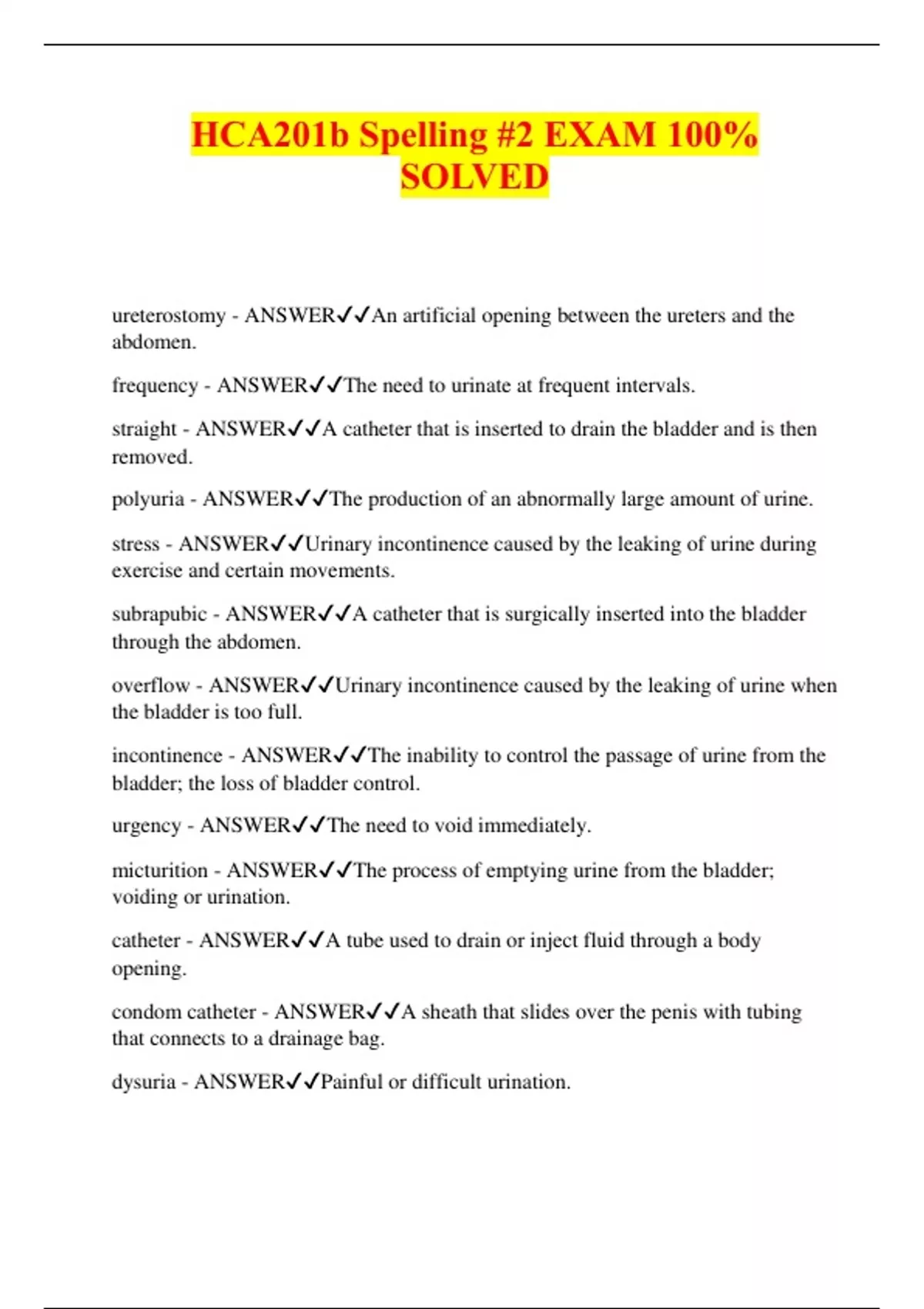 HCA201b Spelling #2 EXAM 100% SOLVED ureterostomy - ANSWERAn artificial opening between the ureters and the abdomen. frequency - ANSWERThe need to urinate at frequent intervals. straight - ANSWERA catheter that is inserted to drain the bladder and is then removed. polyuria - ANSWERThe production of an abnormally large amount of urine. stress - ANSWERUrinary incontinence caused by the leaking of urine during exercise and certain movements. subrapubic - ANSWERA catheter that is surgically inserted into the bladder through the abdomen. overflow - ANSWERUrinary incontinence caused by the leaking of urine when the bladder is too full. incontinence - ANSWERThe inability to control the passage of urine from the bladder; the loss of bladder control