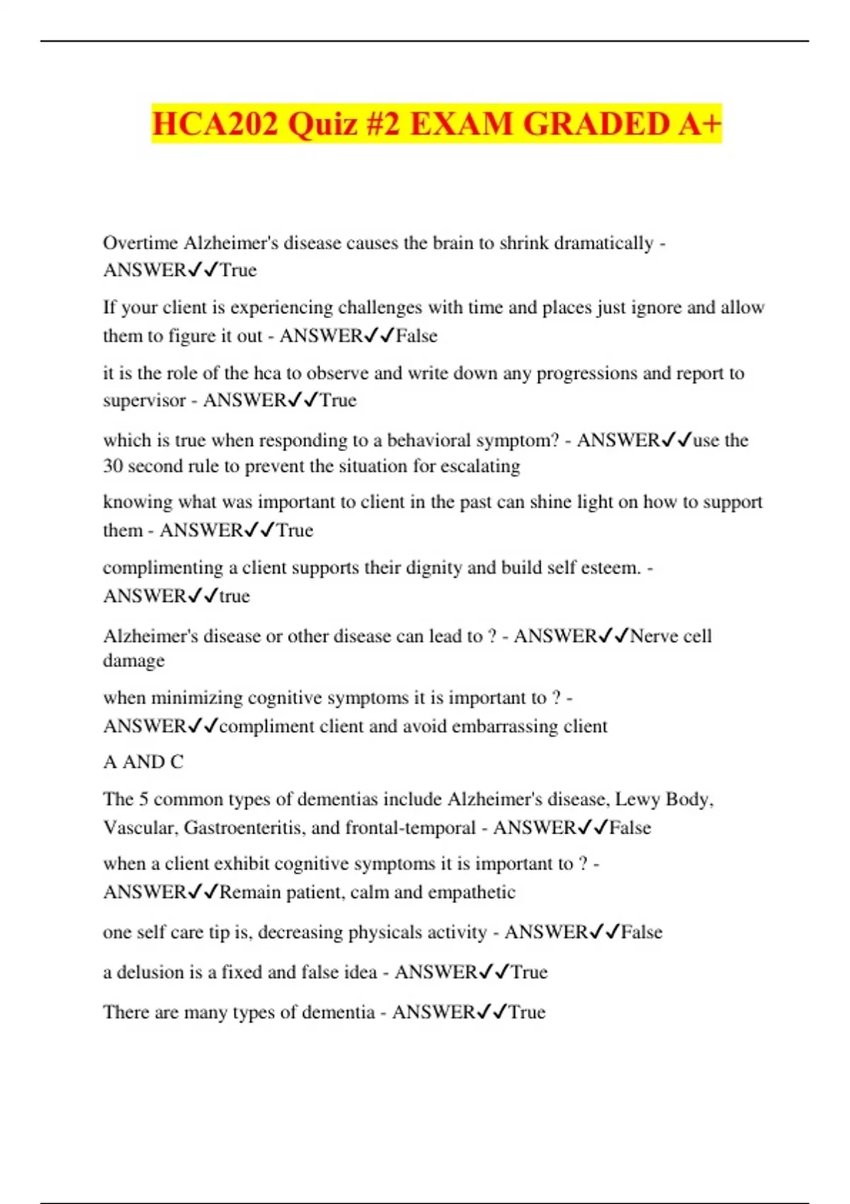 HCA202 Quiz #2 EXAM GRADED A+ Overtime Alzheimer's disease causes the brain to shrink dramatically - ANSWERTrue If your client is experiencing challenges with time and places just ignore and allow them to figure it out - ANSWERFalse it is the role of the hca to observe and write down any progressions and report to supervisor - ANSWERTrue which is true when responding to a behavioral symptom? - ANSWERuse the 30 second rule to prevent the situation for escalating knowing what was important to client in the past can shine light on how to support them - ANSWERTrue complimenting a client supports their dignity and build self esteem. - ANSWERtrue