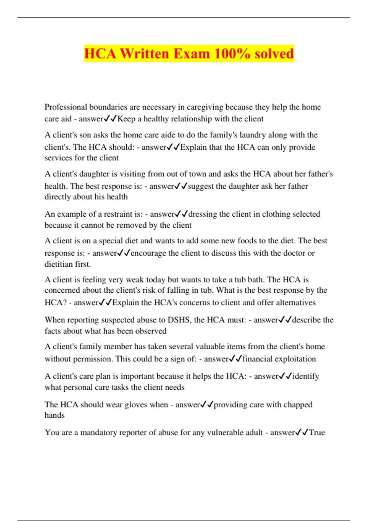 HCA Written Exam 100% solved Professional boundaries are necessary in caregiving because they help the home care aid - answerKeep a healthy relationship with the client A client's son asks the home care aide to do the family's laundry along with the client's. The HCA should: - answerExplain that the HCA can only provide services for the client A client's daughter is visiting from out of town and asks the HCA about her father's health. The best response is: - answersuggest the daughter ask her father directly about his health An example of a restraint is: - answerdressing the client in clothing selected because it cannot be removed by the client A client is on a special diet and wants to add some new foods to the diet. The best response is: - answerencourage the client to discuss this with the doctor or dietitian first. A client is feeling very weak today but wants to take a tub bath. The HCA is concerned about the client's risk of falling in tub. What is the best response by the HCA? - answerExplain the HCA's concerns to client and offer alternatives When reporting suspected abuse to DSHS, the HCA must: - answerdescribe the facts about what has been observed