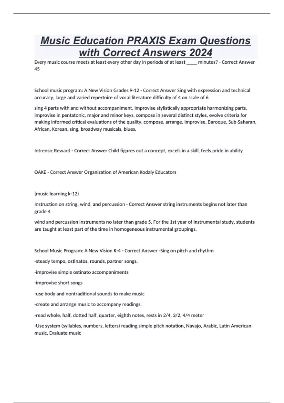 Music Education PRAXIS Exam Questions with Correct Answers 2024