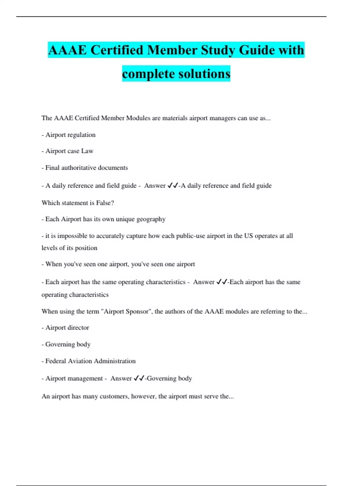 The AAAE Certified Member Modules are materials airport managers can use as... - Airport regulation - Airport case Law - Final authoritative documents - A daily reference and field guide - Answer ️️-A daily reference and field guide Which statement is False? - Each Airport has its own unique geography - it is impossible to accurately capture how each public-use airport in the US operates at all levels of its position - When you've seen one airport, you've seen one airport - Each airport has the same operating characteristics - Answer ️️-Each airport has the same operating characteristics