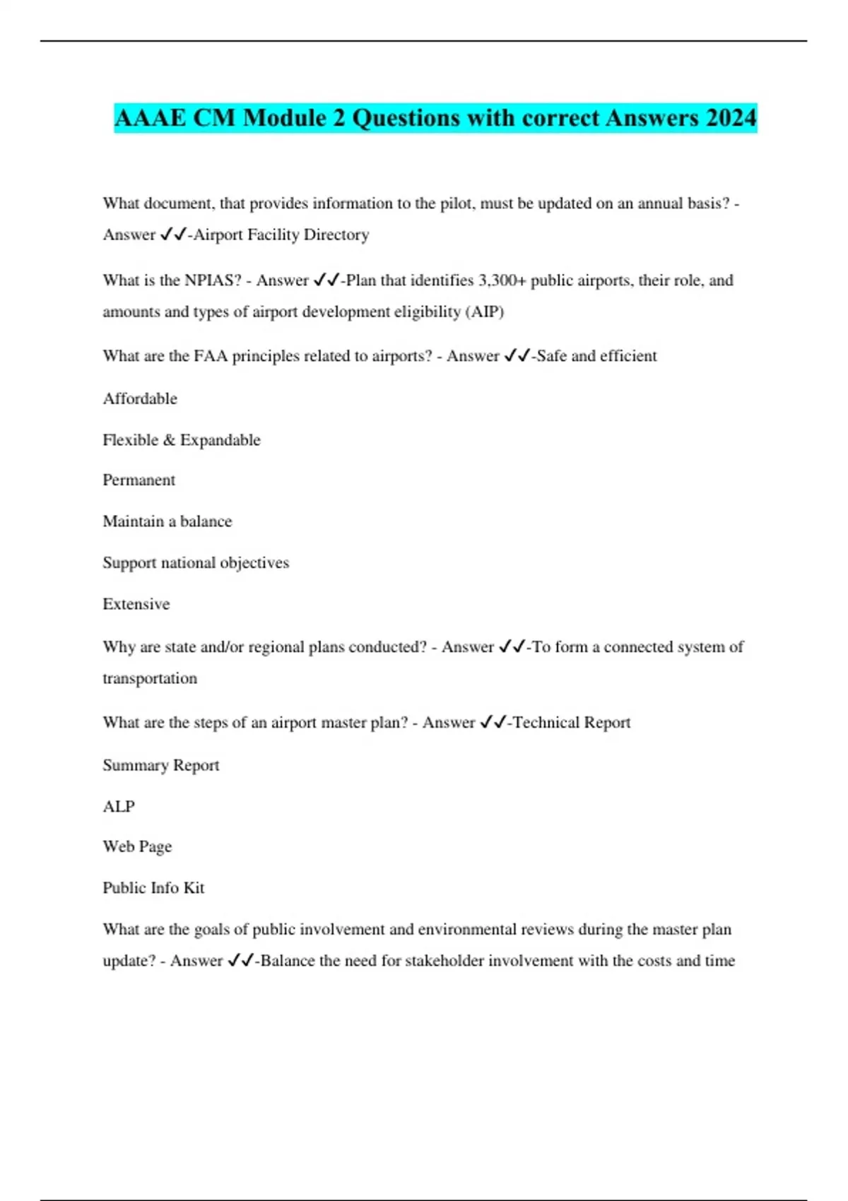 What document, that provides information to the pilot, must be updated on an annual basis? -Answer ️️-Airport Facility Directory What is the NPIAS? - Answer ️️-Plan that identifies 3,300+ public airports, their role, and amounts and types of airport development eligibility (AIP) What are the FAA principles related to airports? - Answer ️️-Safe and efficient Affordable Flexible & Expandable Permanent Maintain a balance Support national objectives Extensive