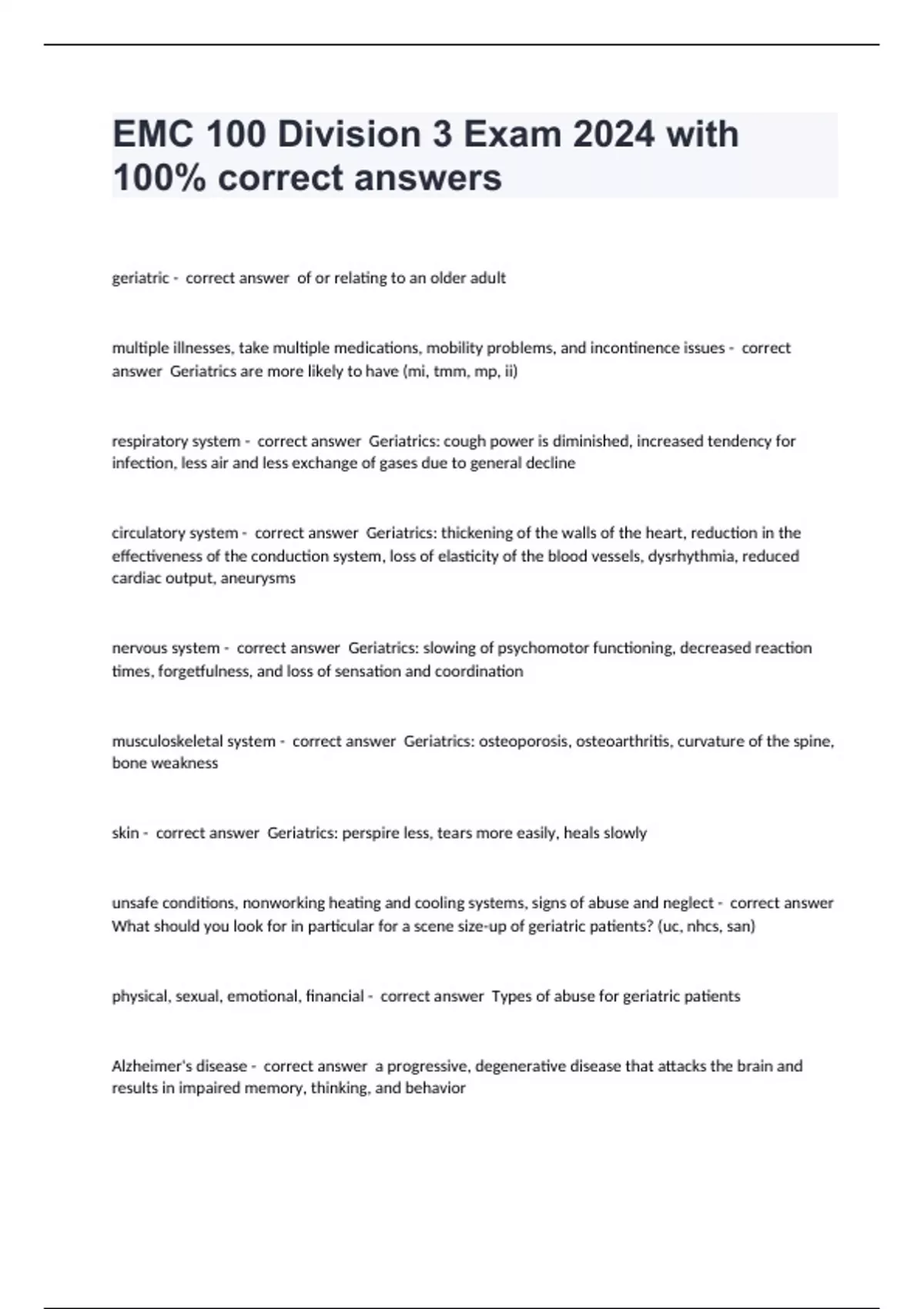 geriatric - correct answer of or relating to an older adult multiple illnesses, take multiple medications, mobility problems, and incontinence issues - correct answer Geriatrics are more likely to have (mi, tmm, mp, ii) respiratory system - correct answer Geriatrics: cough power is diminished, increased tendency for infection, less air and less exchange of gases due to general decline circulatory system - correct answer Geriatrics: thickening of the walls of the heart, reduction in the effectiveness of the conduction system, loss of elasticity of the blood vessels, dysrhythmia, reduced cardiac output, aneurysms nervous system - correct answer Geriatrics: slowing of psychomotor functioning, decreased reaction times, forgetfulness, and loss of sensation and coordination musculoskeletal system - correct answer Geriatrics: osteoporosis, osteoarthritis, curvature of the spine, bone weakness skin - correct answer Geriatrics: perspire less, tears more easily, heals slowly unsafe conditions, nonworking heating and cooling systems, signs of abuse and neglect - correct answer What should you look for in particular for a scene size-up of geriatric patients? (uc, nhcs, san) physical, sexual, emotional, financial - correct answer Types of abuse for geriatric patients Alzheimer's disease - correct answer a progressive, degenerative disease that attacks the brain and results in impaired memory, thinking, and behavior mechanical fall - correct answer a fall caused by a defined slip, trip, or loss of balance elder neglect - correct answer the neglect by caregivers of the needs of an elderly person, usually one who is disabled or frail self-neglect - correct answer a condition whereby an individual fails to attend to his or her own basic needs, such as hygiene, appropriate clothing, medical care, and so on elder abuse