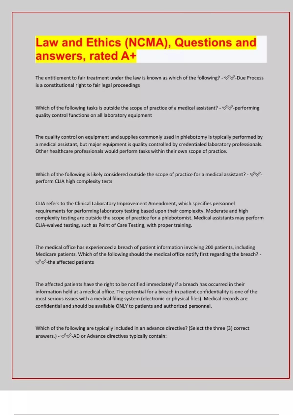 Law and Ethics (NCMA), Questions and answers, rated A+ The entitlement to fair treatment under the law is known as which of the following? - -Due Process is a constitutional right to fair legal proceedings Which of the following tasks is outside the scope of practice of a medical assistant? -