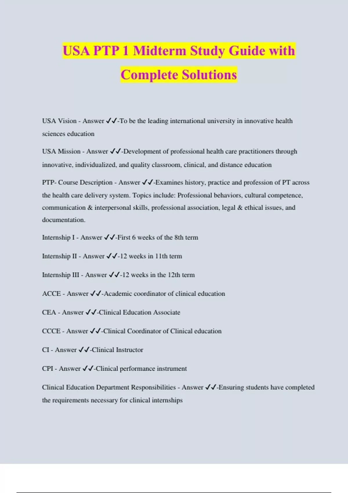 USA PTP 1 Midterm Study Guide with Complete Solutions