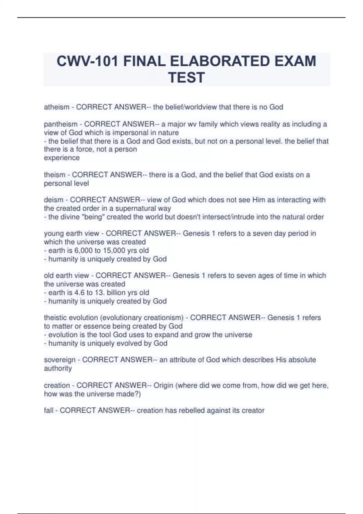 CWV-101 FINAL ELABORATED EXAM TEST atheism - CORRECT ANSWER-- the belief/worldview that there is no God pantheism - CORRECT ANSWER-- a major wv family which views reality as including a view of God which is impersonal in nature - the belief that there is a God and God exists, but not on a personal level. the belief that there is a force, not a person experience theism - CORRECT ANSWER-- there is a God, and the belief that God exists on a personal level deism - CORRECT ANSWER-- view of God which does not see Him as interacting with the created order in a supernatural way - the divine "being" created the world but doesn't intersect/intrude into the natural order young earth view - CORRECT ANSWER-- Genesis 1 refers to a seven day period in which the universe was created - earth is 6,000 to 15,000 yrs old - humanity is uniquely created by God old earth view - CORRECT ANSWER-- Genesis 1 refers to seven ages of time in which the universe was created - earth is 4.6 to 13. billion yrs old - humanity is uniquely created by God theistic evolution (evolutionary creationism) - CORRECT ANSWER-- Genesis 1 refers to matter or essence being created by God - evolution is the tool God uses to expand and grow the universe - humanity is uniquely evolved by God sovereign - CORRECT ANSWER-- an attribute of God which describes His absolute authority creation - CORRECT ANSWER-- Origin (where did we come from, how did we get here, how was the universe made?) fall - CORRECT ANSWER-- creation has rebelled against its creator