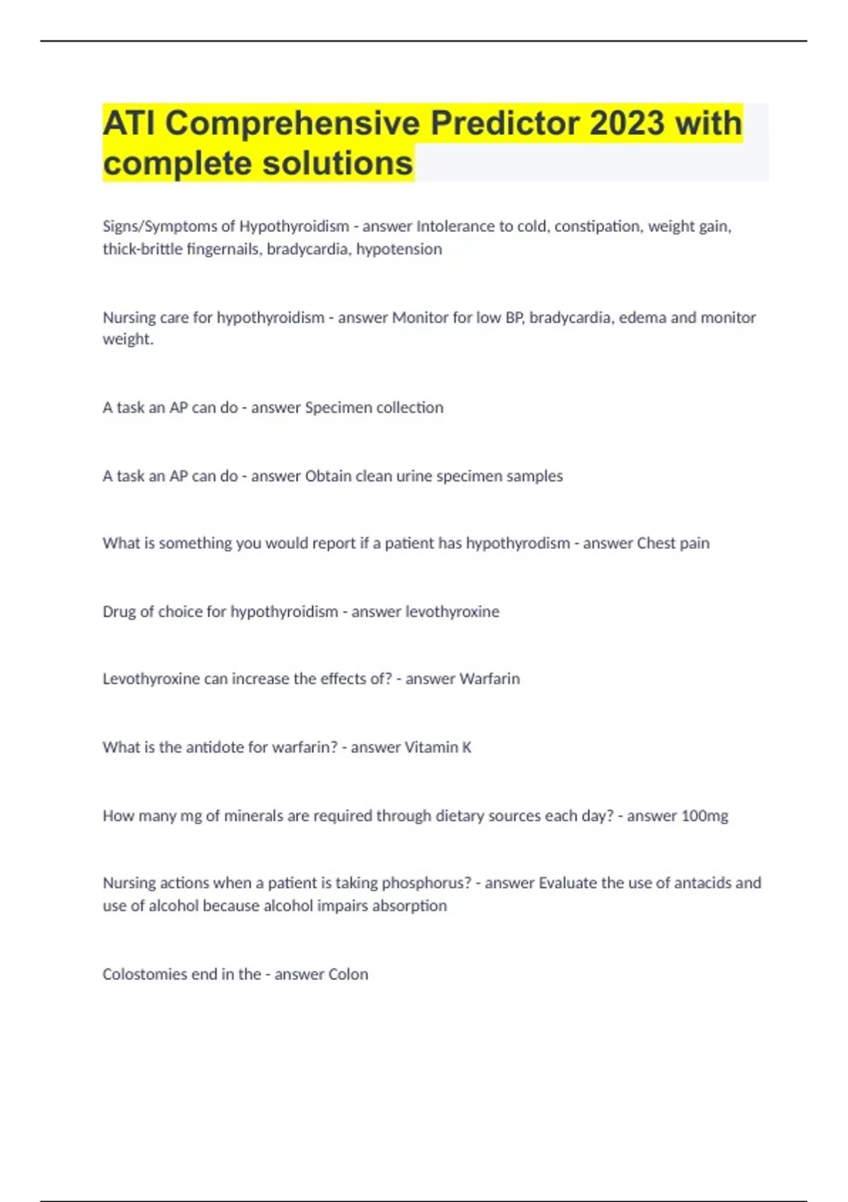 ATI Comprehensive Predictor 2023 with complete solutions Signs/Symptoms of Hypothyroidism - answer Intolerance to cold, constipation, weight gain, thick-brittle fingernails, bradycardia, hypotension Nursing care for hypothyroidism - answer Monitor for low BP, bradycardia, edema and monitor weight. A task an AP can do - answer Specimen collection A task an AP can do - answer Obtain clean urine specimen samples What is something you would report if a patient has hypothyrodism - answer Chest pain Drug of choice for hypothyroidism - answer levothyroxine Levothyroxine can increase the effects of? - answer Warfarin What is the antidote for warfarin? - answer Vitamin K How many mg of minerals are required through dietary sources each day? - answer 100mg Nursing actions when a patient is taking phosphorus? - answer Evaluate the use of antacids and use of alcohol because alcohol impairs absorption