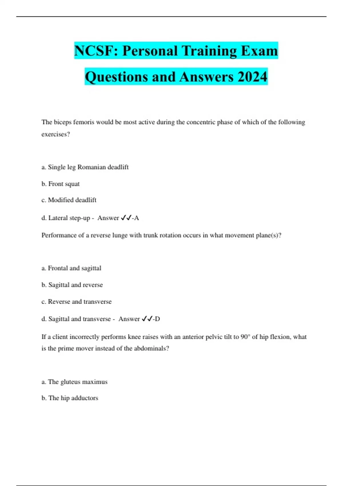 The biceps femoris would be most active during the concentric phase of which of the following exercises? a. Single leg Romanian deadlift b. Front squat c. Modified deadlift d. Lateral step-up - Answer ️️-A Performance of a reverse lunge with trunk rotation occurs in what movement plane(s)? a. Frontal and sagittal b. Sagittal and reverse c. Reverse and transverse d. Sagittal and transverse - Answer ️️-