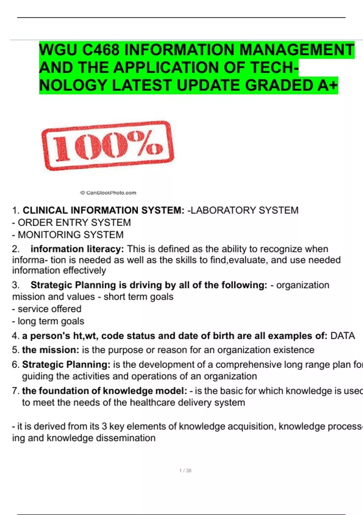 WGU C468 INFORMATION MANAGEMENT AND THE APPLICATION OF TECHNOLOGY LATEST UPDATE GRADED A+ 1 / 38 1. CLINICAL INFORMATION SYSTEM: -LABORATORY SYSTEM - ORDER ENTRY SYSTEM - MONITORING SYSTEM 2. information literacy: This is defined as the ability to recognize when informa- tion is needed as well as the skills to find,evaluate, and use needed information effectively 3. Strategic Planning is driving by all of the following: - organization mission and values - short term goals - service offered - long term goals 4. a person's ht,wt, code status and date of birth are all examples of: DATA 5. the mission: is the purpose or reason for an organization existence 6. Strategic Planning: is the development of a comprehensive long range plan for guiding the activities and operations of an organization 7. the foundation of knowledge model: - is the basic for which knowledge is used to meet the needs of the healthcare delivery system - it is derived from its 3 key elements of knowledge acquisition, knowledge processing and knowledge dissemination WGU C468 INFORMATION MANAGEMENT AND THE APPLICATION OF TECH- NOLOGY 2 / 38 8. Nursing informatics: the use of technology and information to help support all aspects of nursing practices 9. Information Life Cycle: - needs assessment phase - system selection phase - system implementation phase - maintenance phase 10. emerging trends in healthcare: - a push for patient safety - error reduction - additional regulatory requirements 11. Project Scope: the size and details of a collaborative effort NURSES ACTIVE PARTICIPATION IS IMPORTED TO ENSURE THE INFORMATION IS CURRENT AND ACCESSIBLE TO HC TEAM 12. why is the nurses active participation in electronic patient information important: to ensure the information is current and accessible to the healthcare team 13. #1 NEEDS ASSESSMENT PHASE: ORGANIZATION PERFORMS GAPS, ANALYSIS, DETERMINING THE NEEDS AND WANTS IN A INFORMATION SYSTEM 14. #2 SYSTEM SELECTION PHASE: - ORGANIZATION SEEKS OUT A VENDOR COMPANY THAT OFFER THEM A SYSTEM THAT BEST FITS THEIR NEEDS. * RFI- INITIAL CONTACT WITH A VENDOR * RFP- PROPOSAL REQUEST * RFQ- REQUEST FOR PRICING QUOTE 15. #3 SYSTEM IMPLEMENTATION PHASE: - GO LIVe PLANNING - TRAINING OF END-USERS - EXECUTE SYSTEM CHANGES 16. #4 MAINTENANCE PHASE: - PROBLEM SOLVING, DEBUGGING - BACKUP FILES WGU C468 INFORMATION MANAGEMENT AND THE APPLICATION OF TECH- NOLOGY 3 / 38 - INSTALLING SYSTEM UPGRADES 17. ESSENTIAL COMPONENTS OF THE EHR: - ASSESSMENT FINDINGS - PATIENT DEMOGRAPHICS - VITAL SIGNS 18. EXAMPLE OF A ESSENTIAL COMPONENT OF THE EHR:: EVIDENCE - BASED DECISION SUPPORT 19. Function of EHR:: BARCODE MEDICATION ADMINISTRATION (BCMA) 20. CPOE (Computerized Physician Order Entry): THE PROCESS BY WHICH THE DR OR PROVIDER ENTERS ORDERS ELECTRONICALLY INTO THE EHR 21. A BENEFIT OF THE EHR IS THAT IT CAN PROVIDE PATIENT SUPPORT, GIVE A EXAMPLE OF PT SUPPORT: EDUCATION MATERIAL SUCH AS FOR REDUCING SODIUM INTAKE 22. BENEFITS TO USING THE EHR: Reduces medication errors, improves provider documentation 23. HEALTH INFORMATION SYSTEM: - ADMINISTRATIVE INFORMATION SYSTEM - CLINICAL INFO SYSTEM 24. PRIMARY FUNCTIONALITY IN CONTRAST TO THAT OF A HEALTH INFOR- MATION SYSTEM: TO PROMOTE PATIENT SAFETY 25. AN EXAMPLE OF A BARRIER TO PATIENT CENTERED CARE: WAITING UNTIL THE END OF THE SHIFT TO DOCUMENT YOUR PATIENT ASSESSMENTS INTO THE EHR 26. CLINICAL INFORMATION SYSTEM: - LABORATORY SYSTEM - PHARMACY SYSTEM - CLINICAL DOCUMENTATION SYSTEM 27. ADMINISTRATIVE INFO SYSTEM: - REGISTRATION SYSTEM - FINANCIAL SYSTEM - SCHEDULING SYSTEM 28. CONNECTION NEEDED TO ACCESS THE EHR WHEN AN INTERNET CON- NECTION IS LOST: LOCAL AREA NETWORK ACCESS(LAN)