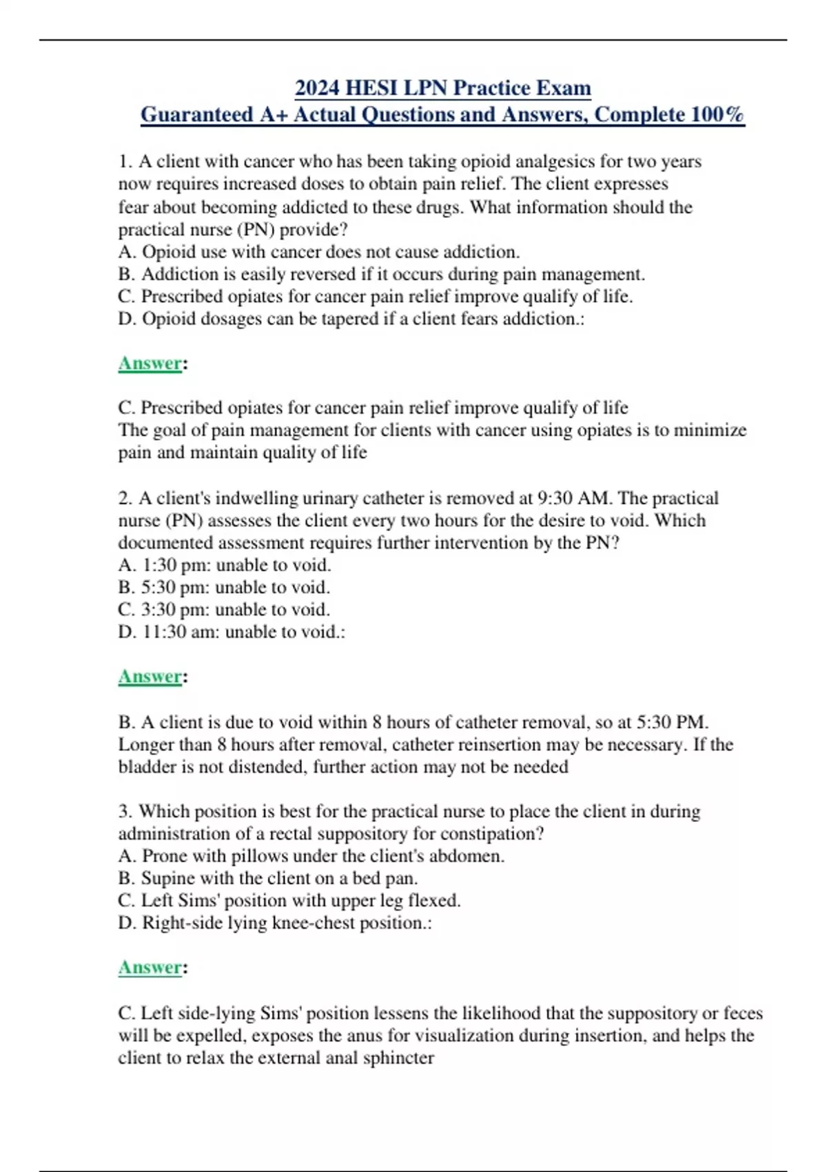 2024 HESI LPN Practice Exam Guaranteed A+ Actual Questions and Answers, Complete 100% 1. A client with cancer who has been taking opioid analgesics for two years now requires increased doses to obtain pain relief. The client expresses fear about becoming addicted to these drugs. What information should the practical nurse (PN) provide? A. Opioid use with cancer does not cause addiction. B. Addiction is easily reversed if it occurs during pain management. C. Prescribed opiates for cancer pain relief improve qualify of life. D. Opioid dosages can be tapered if a client fears addiction.: Answer: C. Prescribed opiates for cancer pain relief improve qualify of life The goal of pain management for clients with cancer using opiates is to minimize pain and maintain quality of life 2. A client's indwelling urinary catheter is removed at 9:30 AM. The practical nurse (PN) assesses the client every two hours for the desire to void. Which documented assessment requires further intervention by the PN? A. 1:30 pm: unable to void. B. 5:30 pm: unable to void. C. 3:30 pm: unable to void. D. 11:30 am: unable to void.: Answer: B. A client is due to void within 8 hours of catheter removal, so at 5:30 PM. Longer than 8 hours after removal, catheter reinsertion may be necessary. If the bladder is not distended, further action may not be needed 3. Which position is best for the practical nurse to place the client in during administration of a rectal suppository for constipation? A. Prone with pillows under the client's abdomen. B. Supine with the client on a bed pan. C. Left Sims' position with upper leg flexed. D. Right-side lying knee-chest position.: Answer: C. Left side-lying Sims' position lessens the likelihood that the suppository or feces will be expelled, exposes the anus for visualization during insertion, and helps the client to relax the external anal sphincter