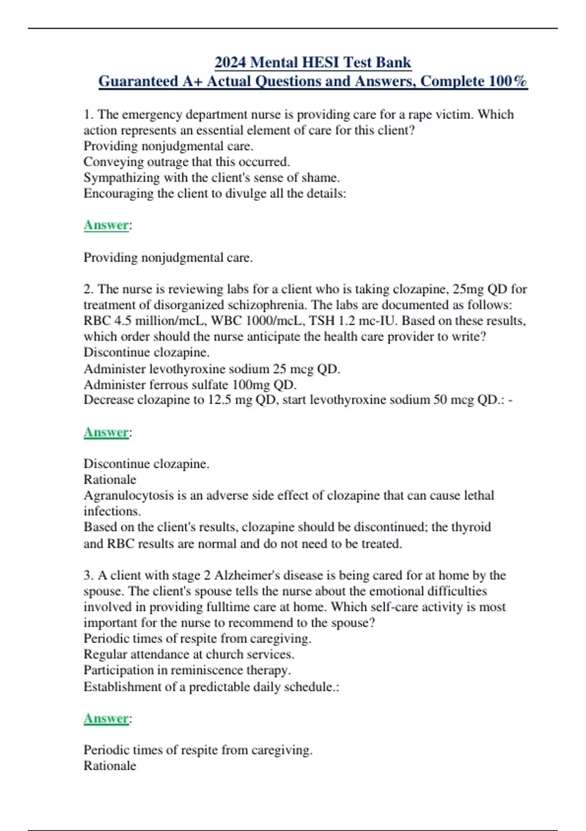 2024 Mental HESI Test Bank Guaranteed A+ Actual Questions and Answers, Complete 100% 1. The emergency department nurse is providing care for a rape victim. Which action represents an essential element of care for this client? Providing nonjudgmental care. Conveying outrage that this occurred. Sympathizing with the client's sense of shame. Encouraging the client to divulge all the details: Answer: Providing nonjudgmental care. 2. The nurse is reviewing labs for a client who is taking clozapine, 25mg QD for treatment of disorganized schizophrenia. The labs are documented as follows: RBC 4.5 million/mcL, WBC 1000/mcL, TSH 1.2 mc-IU. Based on these results, which order should the nurse anticipate the health care provider to write? Discontinue clozapine. Administer levothyroxine sodium 25 mcg QD. Administer ferrous sulfate 100mg QD. Decrease clozapine to 12.5 mg QD, start levothyroxine sodium 50 mcg QD.: - Answer: Discontinue clozapine. Rationale Agranulocytosis is an adverse side effect of clozapine that can cause lethal infections. Based on the client's results, clozapine should be discontinued; the thyroid and RBC results are normal and do not need to be treated. 3. A client with stage 2 Alzheimer's disease is being cared for at home by the spouse. The client's spouse tells the nurse about the emotional difficulties involved in providing fulltime care at home. Which self-care activity is most important for the nurse to recommend to the spouse? Periodic times of respite from caregiving. Regular attendance at church services. Participation in reminiscence therapy. Establishment of a predictable daily schedule.: Answer: Periodic times of respite from caregiving. Rationale